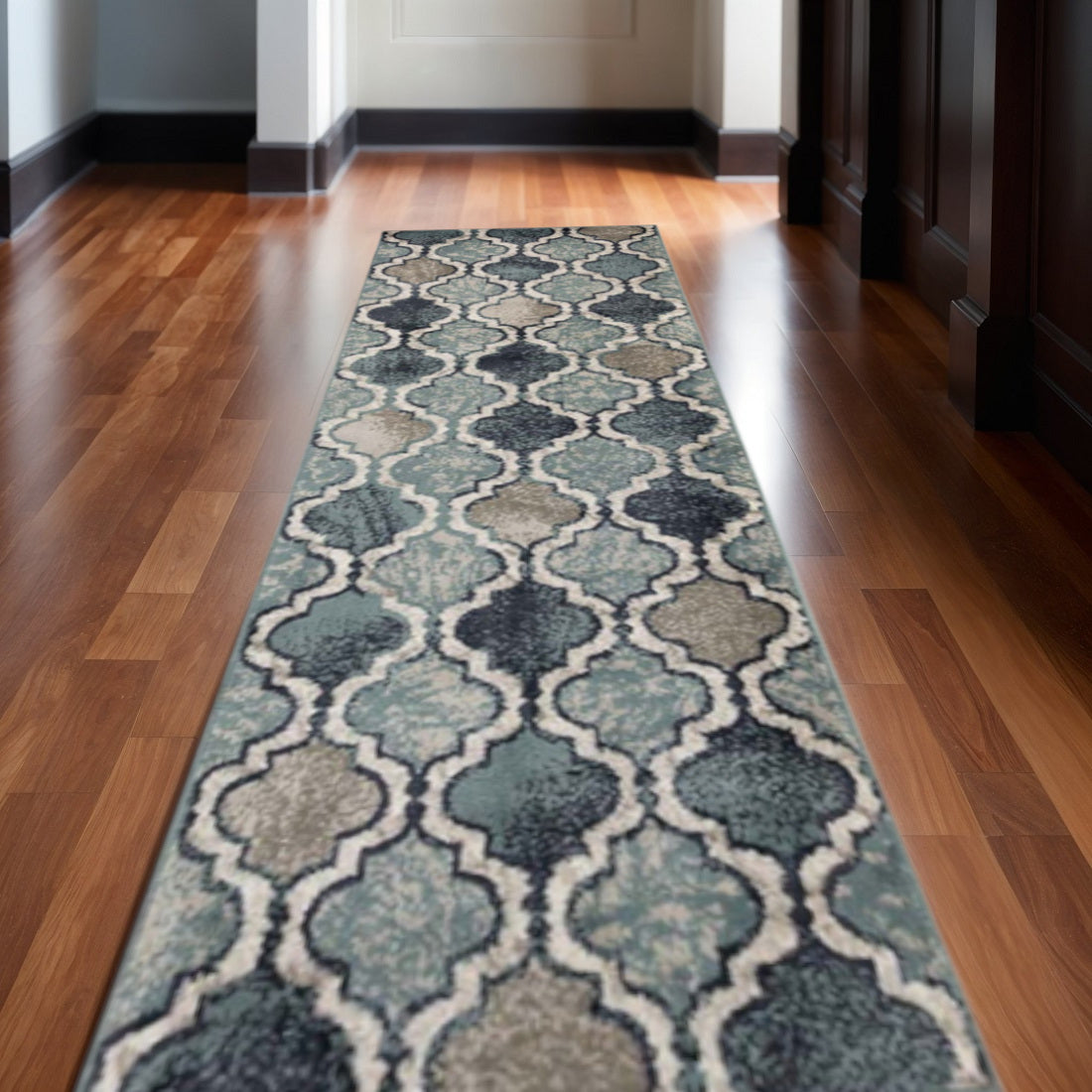 This 10' deep royal quatrefoil power loom distressed stain resistant runner rug, is a great way to add warmth to a room. This runner shaped rug features a quatrefoil design in deep royal to give it visual interest. A classic shape marries with good looking design for your space This superior Turkish rug represents the highest quality and is built to last. Ideal for spaces with kids and pets, this rug is stain resistant to help repel stains and spilled liquids. Place this area rug against a hardwood or tile floor and it will enliven your living space with style and sophistication. 0.31" H x 32.4" W x 120" D