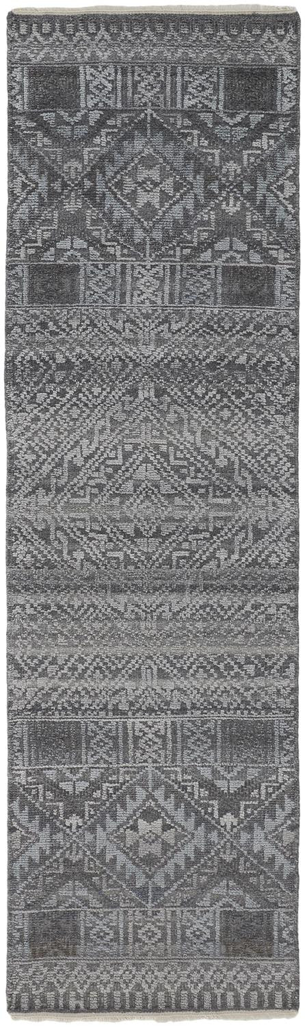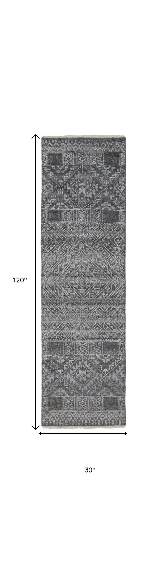 Set an inviting tone in your space with this 10-foot gray ivory and blue geometric hand knotted runner rug with fringe. Crafted by skilled artisans, this hand knotted rug is genuine and unique. No two will be exactly alike. Crafted from wool blend fibers that give this piece premium texture, refinement, and appeal. This runner shaped rug features a geometric design that will add a functional and decorative accent to your space. Tassel ends bring a timeless and fashionable look to your interior. This smaller sized rug is just what you need for your walkway, or in front of door, cabinet, refrigerator, or chair. 30-inch h x 120-inch w x 0.31-inch d