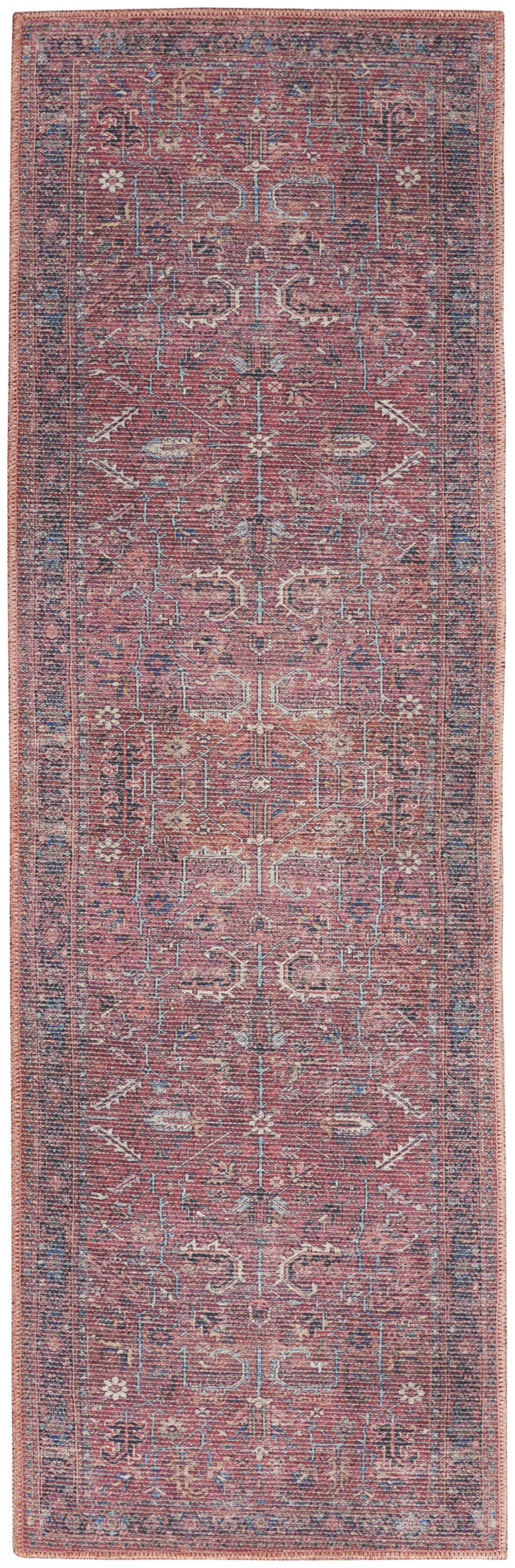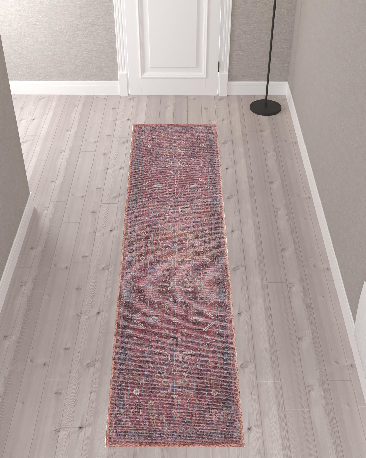 This 10-foot blue and red floral power loom distressed washable runner rug, is a great way to add warmth to a room. This runner shaped rug features a floral design in blue and red to give it visual interest. A classic shape marries with good looking design for your space Place this area rug against a hardwood or tile floor and it will enliven your living space with style and sophistication. 0.28-inch H x 26.00-inch W x 120.00-inch D