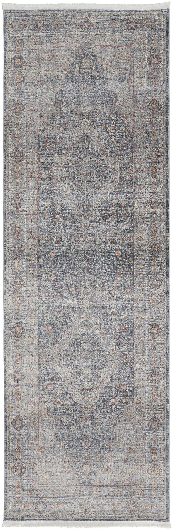 This 10-foot gray blue and red oriental power loom runner rug with fringe, is a great way to add warmth to a room. This runner shaped rug features a oriental design that will add a functional and decorative accent to your space. Ideal for spaces with kids and pets, this rug is stain resistant to help repel dirt and spilled liquids. Tassel ends bring a timeless and fashionable look to your interior. This smaller sized rug is just what you need for your walkway, or in front of door, cabinet, refrigerator, or chair. 32-inch h x 120-inch w x 0.25-inch d