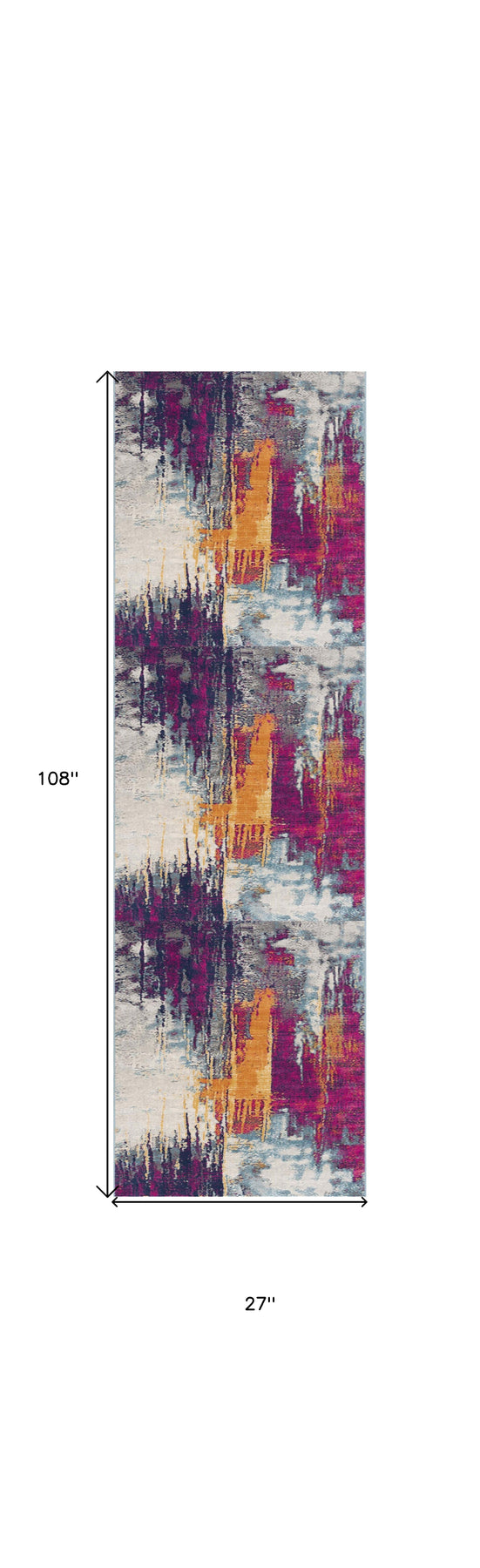 Add some artistry to your room with this 9-foot purple orange and gray abstract runner rug. Ideal for spaces with kids and pets, this rug is stain resistant to help repel dirt and spilled liquids. Built to last, this rug crafted from polypropylene fibers is known for its durability and long lasting appeal. Rugs are a great way to showcase your style, hide imperfections, warm your home and reduce noise. This mid-century style runner makes a great accent for the hallway, in front of cabinets, in the laundry room, or any other space you need a narrow and long rug. 27-inch h x 108-inch w x 0.4-inch d.
