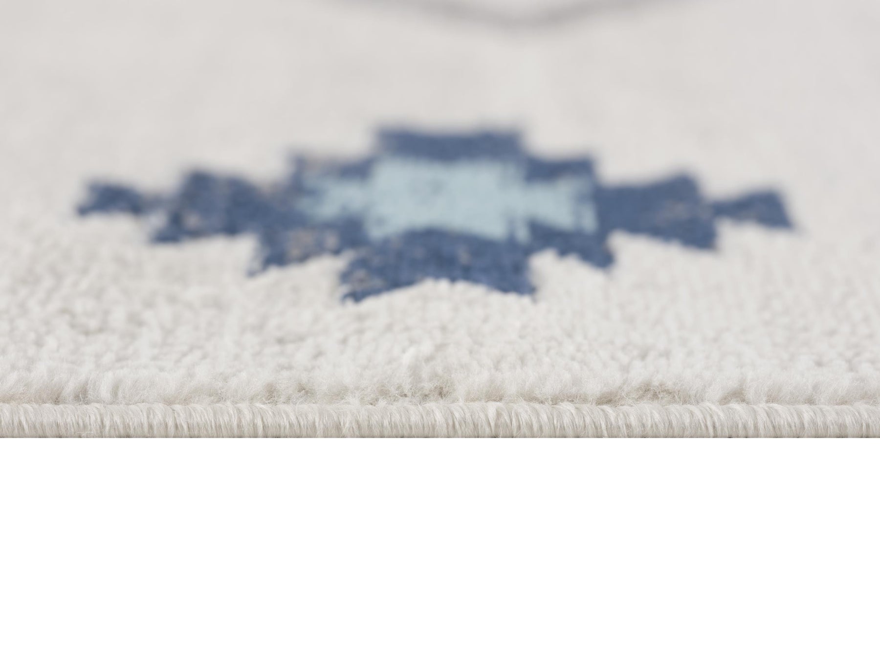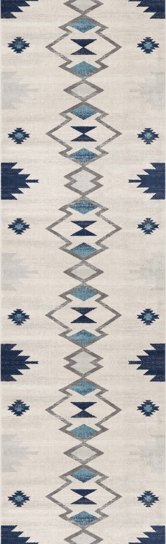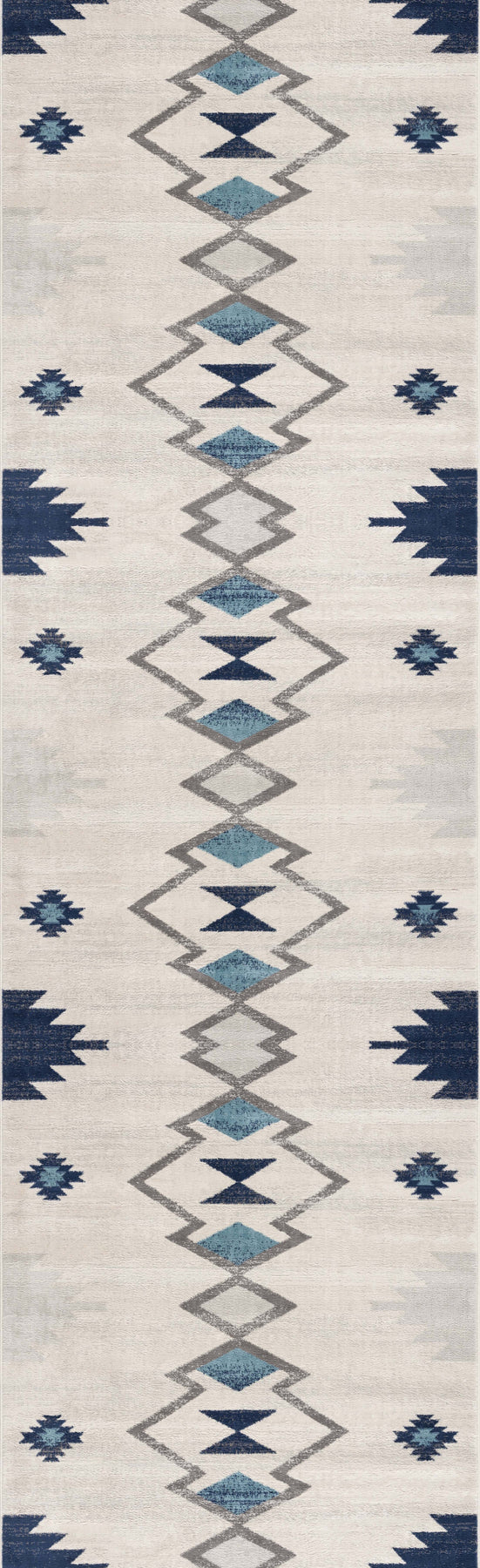 Add great coloration and comfortable texture to your space with this 9-foot blue beige and gray southwestern runner rug. Ideal for spaces with kids and pets, this rug is stain resistant to help repel dirt and spilled liquids. Built to last, this rug crafted from polypropylene fibers is known for its durability and long lasting appeal. Rugs are a great way to showcase your style, hide imperfections, warm your home and reduce noise. This contemporary style runner makes a great accent for the hallway, in front of cabinets, in the laundry room, or any other space you need a narrow and long rug. 27-inch h x 108-inch w x 0.4-inch d.