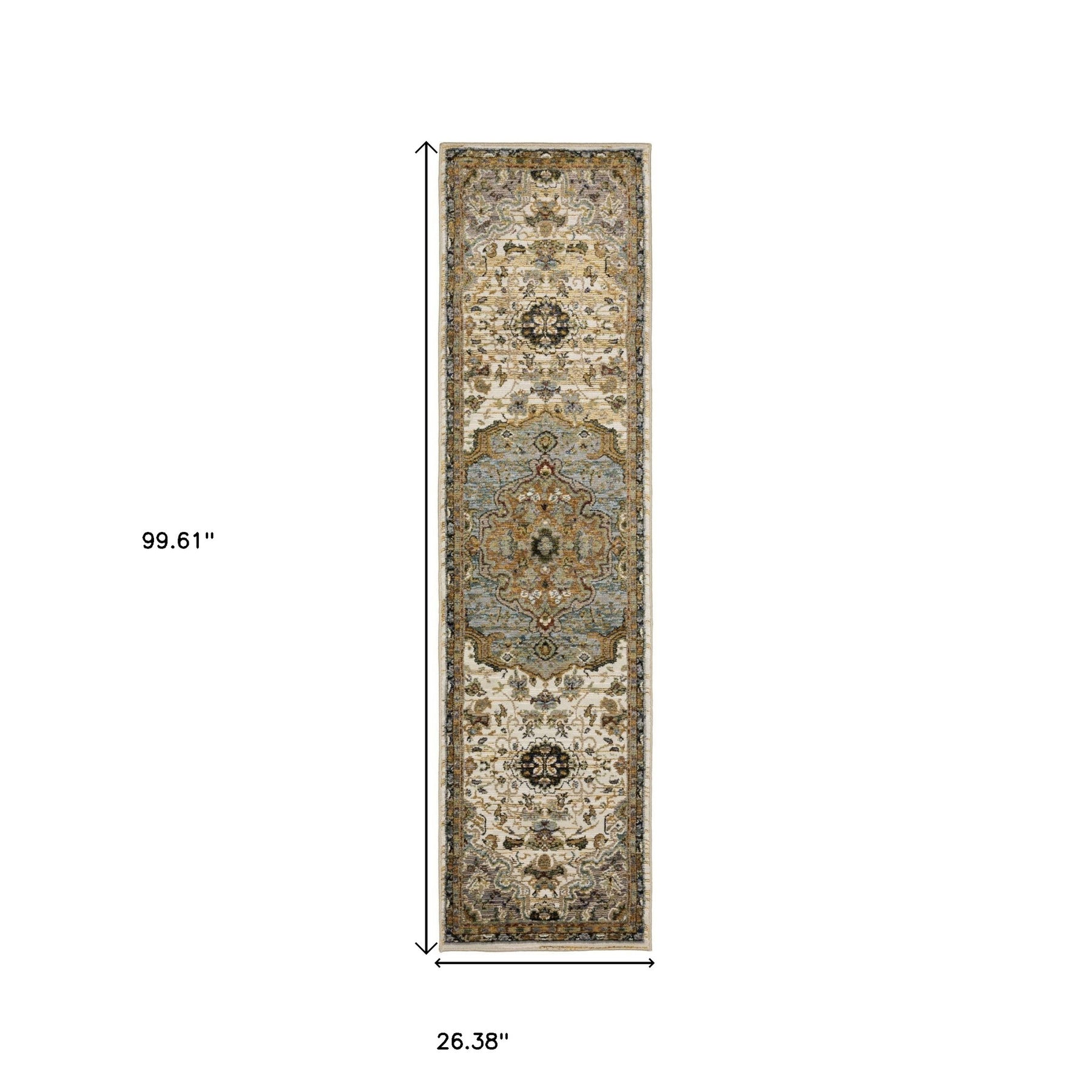 Set an inviting tone in your space with this 8-foot ivory oriental power loom runner rug. This runner shaped rug features a oriental design in ivory to give it visual interest. A classic shape marries with good looking design for your space the coloring of this rug adds a delightfully neutral tone to your home and will easily match with most any decor. Ideal for spaces with kids and pets, this rug is stain resistant to help repel stains and spilled liquids. Place this area rug against a hardwood or tile floor and it will enliven your living space with style and sophistication. 26.38-inch H x 99.61-inch W x 0.55-inch D