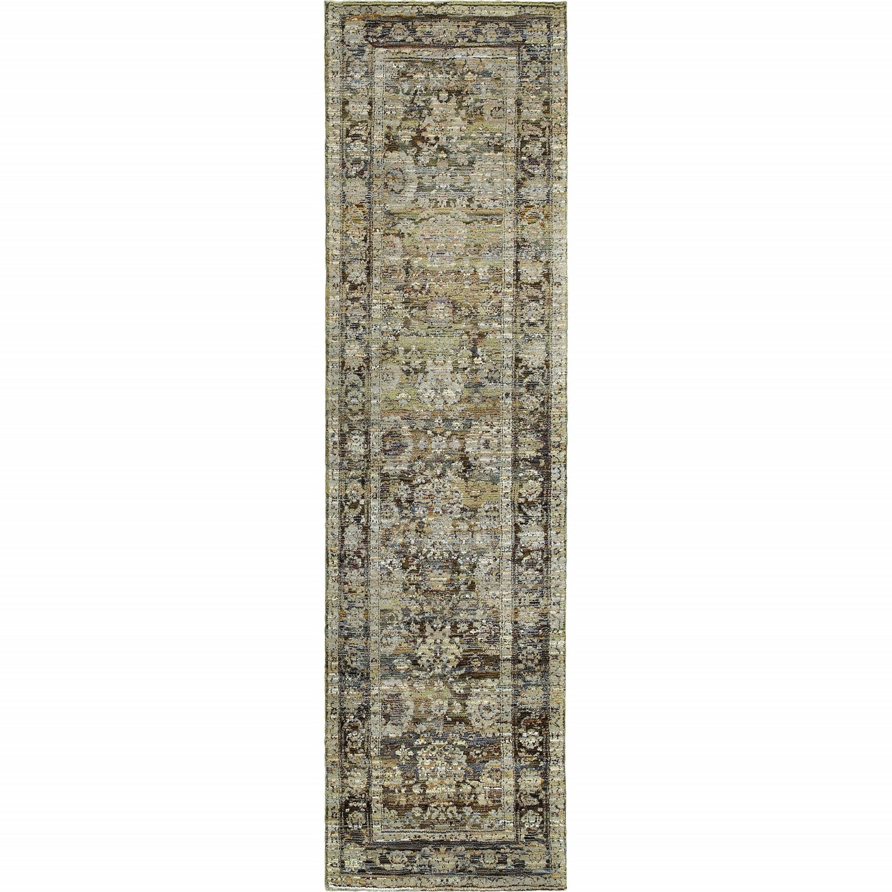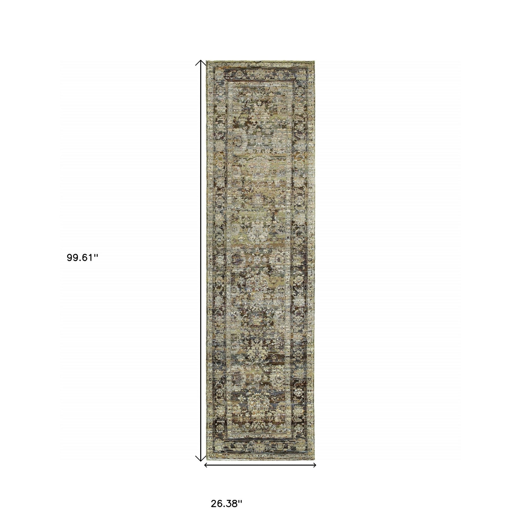 Renovate an understated area of your place with this classic Green and Brown Floral Area Rug to bring an earthy essence to your living space. The unique blend of moss green and teal blue backdrop is flaunted by the intricate floral patterns in shades of beige, brown, and ivory with a prominent border all around, creating a compelling visual effect. This USA-made rug is machine-woven of nylon and polypropylene, making it durable and stain-resistant for a prolonged period. Perfect for indoor usage, the cut-pile construction ensures a plush and cozy feel under the feet. If youÕre into traditional aesthetics, nothing can beat the detailed accents of this area rug to induce a vintage core on the floor. 1Ó x 26.38Ó x 99.61Ó