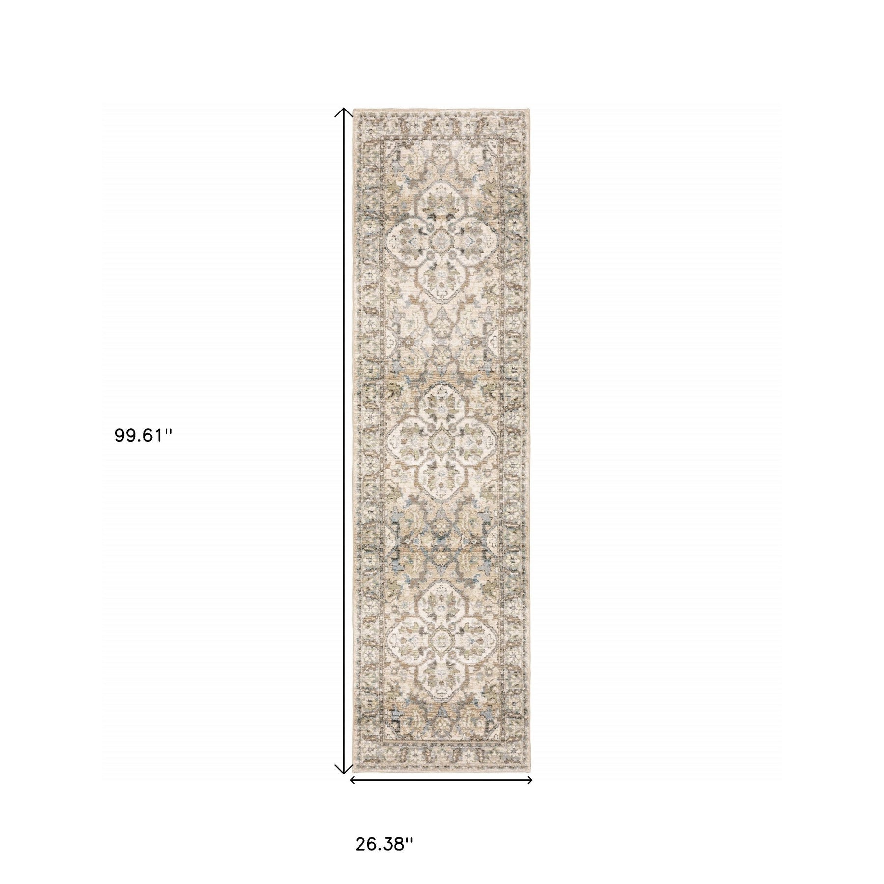The traditional charm of this Beige and Ivory Medallion Runner Rug will transform your living space with a timeless style signifying class and comfort. The ivory backdrop is intricately designed with beige and gray eclectic accents flaunting a floral medallion in the center. It is made in the United States with machine-woven nylon and polypropylene mix and the cut-pile construction adds to its surface interest. Roll this neutral-toned runner rug on the floor and it will seamlessly blend in with any interior theme upholding an airy ambiance to your space. 1Ó x 26.38Ó x 99.61Ó