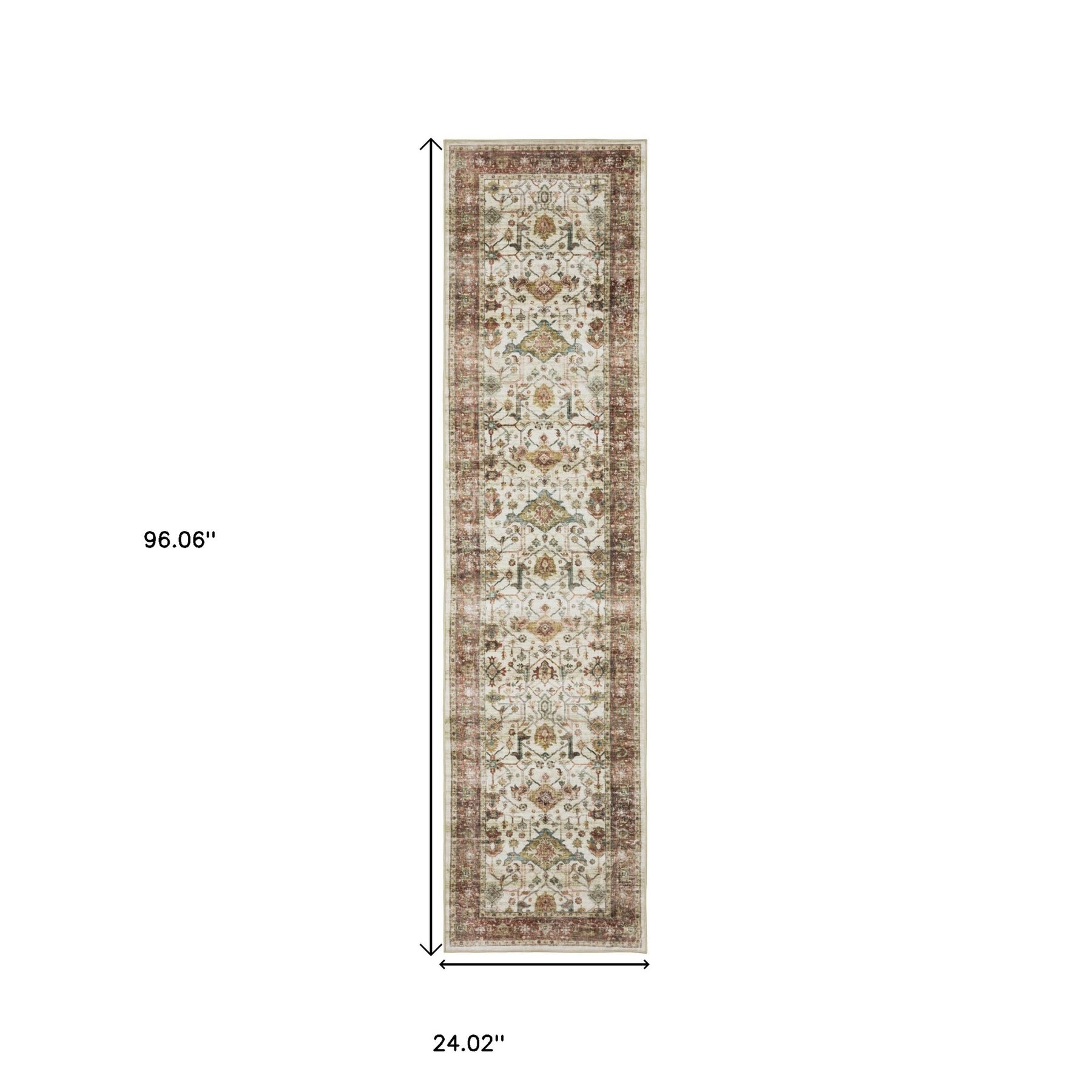Set an inviting tone in your space with this 8-foot ivory oriental non skid runner rug. This runner shaped rug features a oriental design in ivory to give it visual interest. A classic shape marries with good looking design for your space the coloring of this rug adds a delightfully neutral tone to your home and will easily match with most any decor. Ideal for spaces with kids and pets, this rug is stain resistant to help repel stains and spilled liquids. Area rugs help to give warmth and sense of home to your space. 24.02-inch H x 96.06-inch W x 0.12-inch D