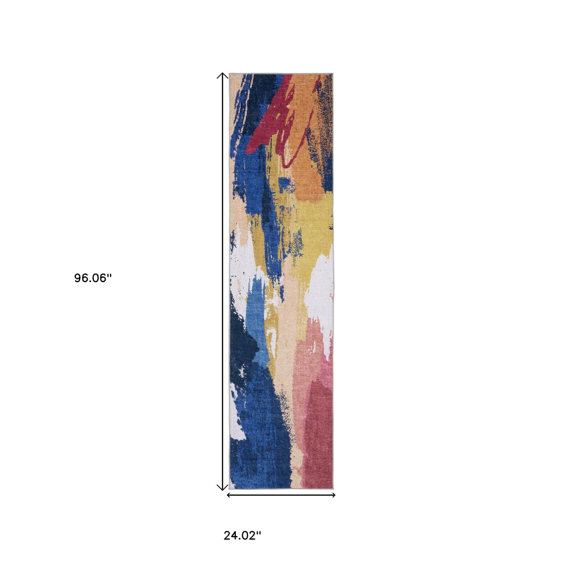 This 8-foot blue abstract non skid runner rug, is a great way to add warmth to a room. This runner shaped rug features a abstract design in blue to give it visual interest. A classic shape marries with good looking design for your space ideal for spaces with kids and pets, this rug is stain resistant to help repel stains and spilled liquids. Place this area rug against a hardwood or tile floor and it will enliven your living space with style and sophistication. 24.02-inch H x 96.06-inch W x 0.12-inch D