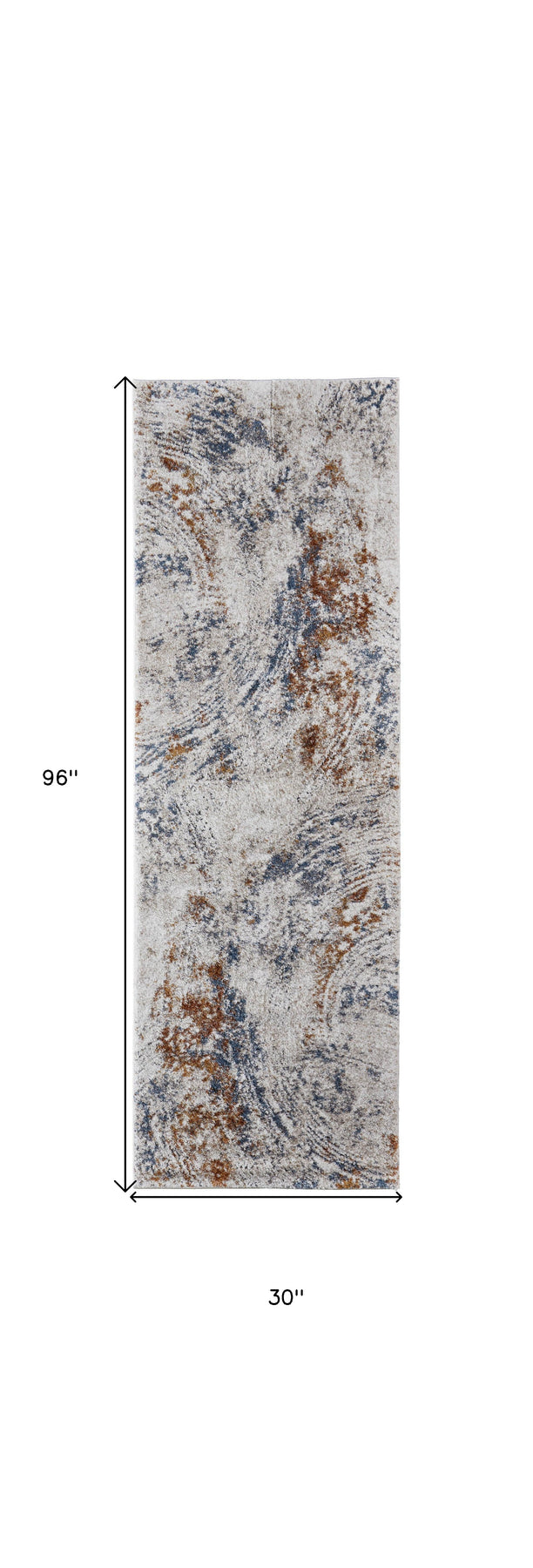 This 8-foot ivory blue and brown abstract power loom runner rug, is a great way to add warmth to a room. This runner shaped rug features a abstract design in ivory blue and brown to give it visual interest. A classic shape marries with good looking design for your space ideal for spaces with kids and pets, this rug is stain resistant to help repel stains and spilled liquids. Place this area rug against a hardwood or tile floor and it will enliven your living space with style and sophistication. 30-inch H x 96-inch W x 0.87-inch D