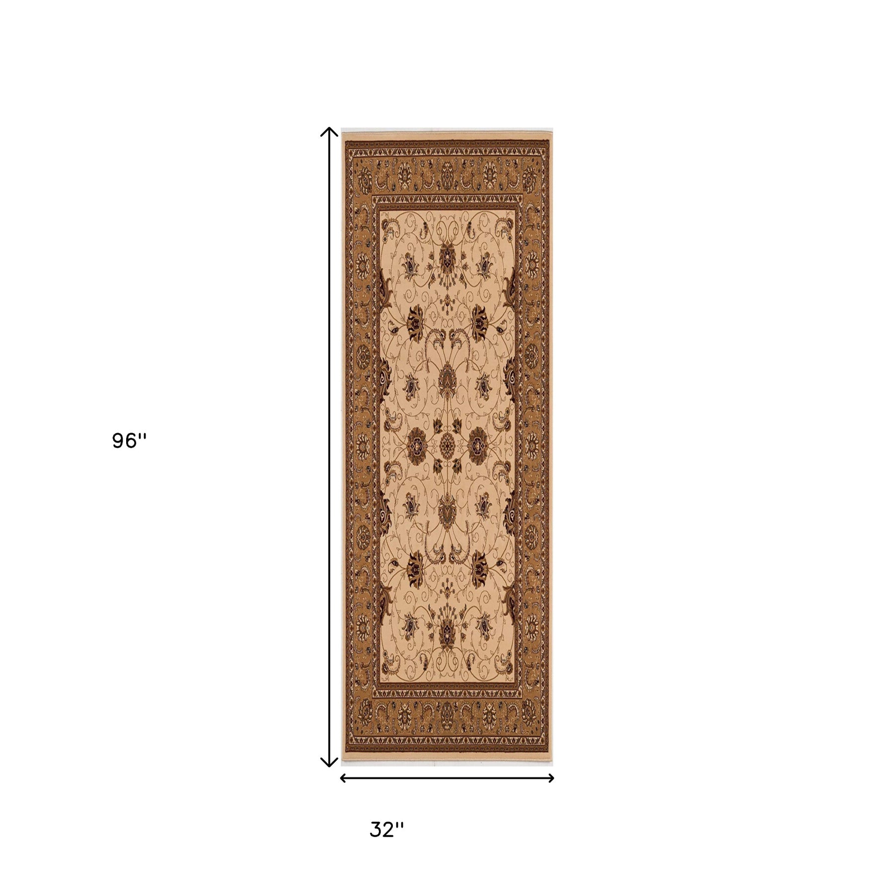 Set an inviting tone in your space with this 8-foot beige and ivory oriental runner rug. Built to last, this rug crafted from olefin fibers is known for its durability and long lasting appeal. Rugs are a great way to showcase your style, hide imperfections, warm your home and reduce noise. This rectangular shaped rug features a abstract design that will add a functional and decorative accent to your space. This transitional style runner makes a great accent for the hallway, in front of cabinets, in the laundry room, or any other space you need a narrow and long rug. 32-inch h x 96-inch w x 0.6-inch d.