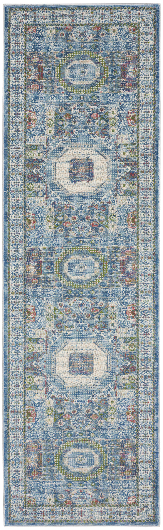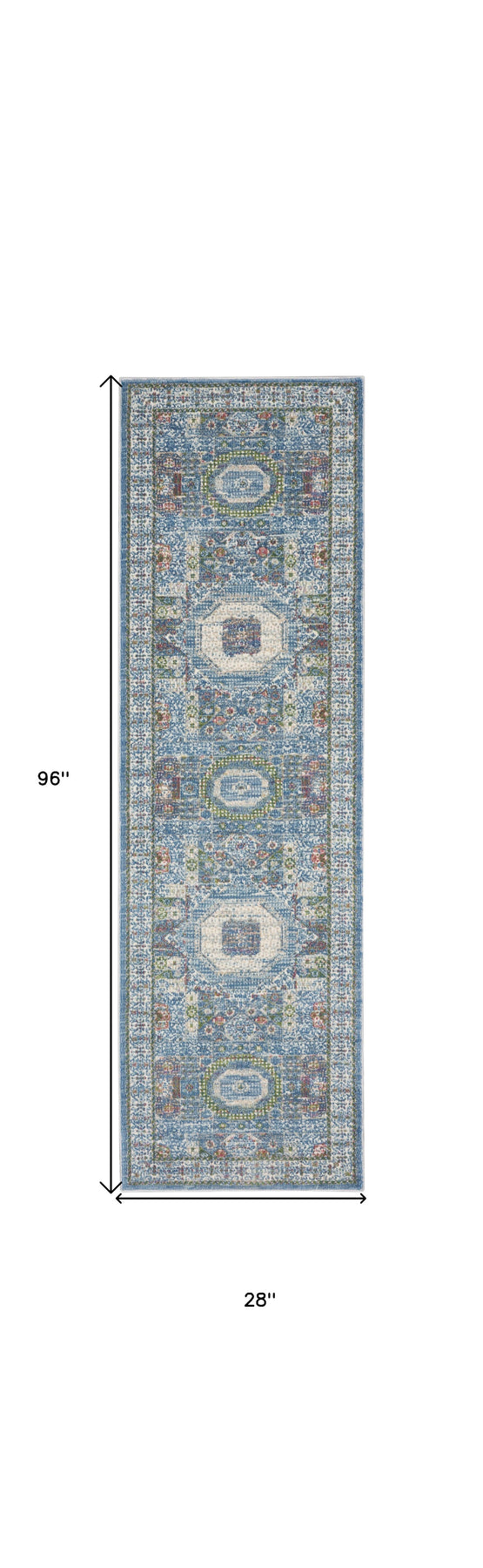 This 8-foot ivory blue and green oriental distressed non skid runner rug, is a great way to add warmth to a room. Built to last, this rug crafted from polypropylene and polyester blend fibers is known for its durability and long lasting appeal. Rugs are a great way to showcase your style, hide imperfections, warm your home and reduce noise. This rectangular shaped rug features a abstract design that will add a functional and decorative accent to your space. This bohemian styled runners makes a great accent for the hallway, in front of cabinets, in the laundry room, or any other space you need a narrow and long rug. 28-inch h x 96-inch w x 0.5-inch d
