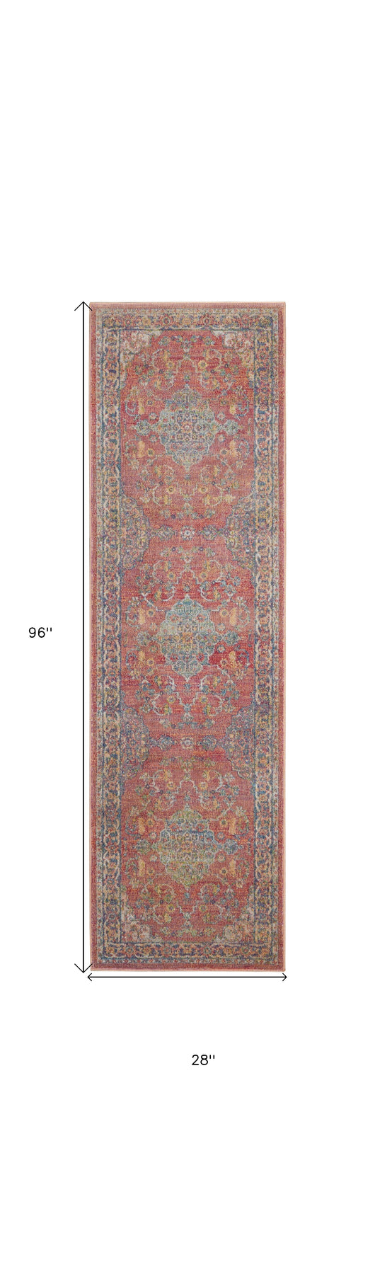 Add great coloration and comfortable texture to your space with this 8-foot blue and red floral medallion distressed non skid runner rug. Built to last, this rug crafted from polypropylene and polyester blend fibers is known for its durability and long lasting appeal. Rugs are a great way to showcase your style, hide imperfections, warm your home and reduce noise. This rectangular shaped rug features a abstract design that will add a functional and decorative accent to your space. This traditional styled runners makes a great accent for the hallway, in front of cabinets, in the laundry room, or any other space you need a narrow and long rug. 28-inch h x 96-inch w x 0.5-inch d