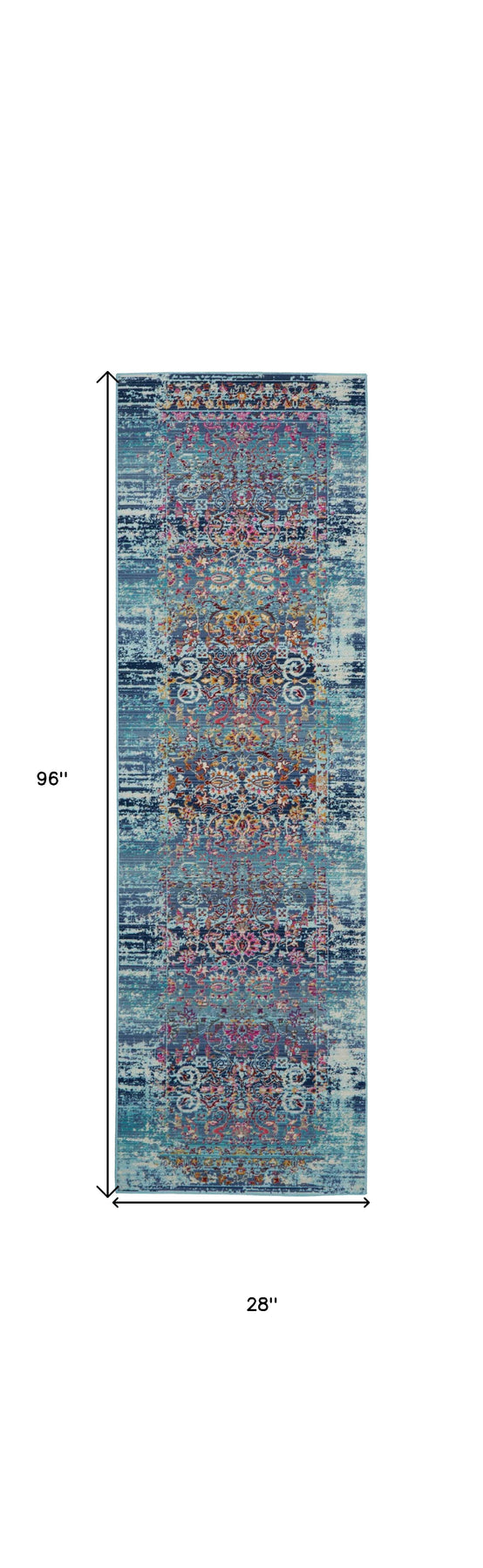 Add some artistry to your room with this 8-foot blue red and orange floral distressed runner rug. Ideal for spaces with kids and pets, this rug is stain resistant to help repel dirt and spilled liquids. Built to last, this rug crafted from polypropylene fibers is known for its durability and long lasting appeal. Rugs are a great way to showcase your style, hide imperfections, warm your home and reduce noise. This rectangular shaped rug features a abstract design that will add a functional and decorative accent to your space. This transitional style runner makes a great accent for the hallway, in front of cabinets, in the laundry room, or any other space you need a narrow and long rug. 28-inch h x 96-inch w x 0.5-inch d.