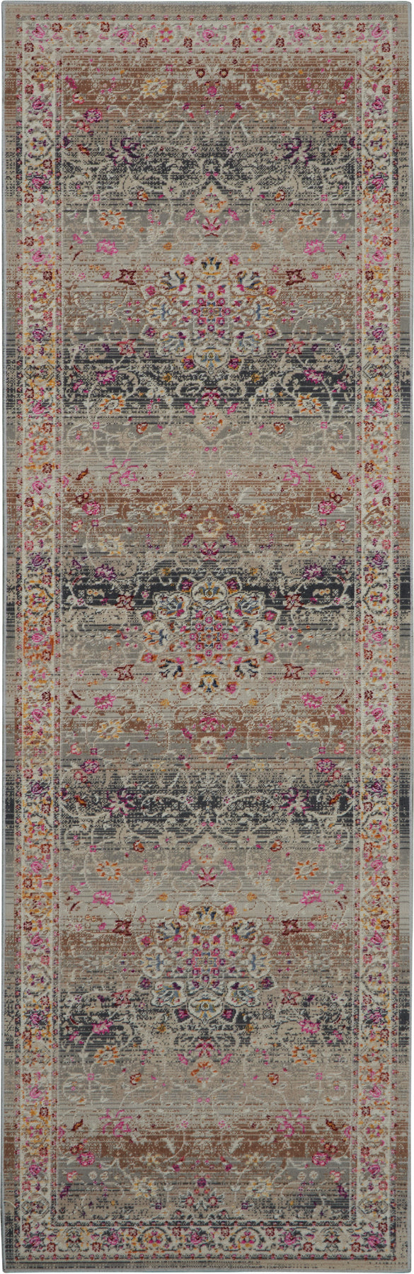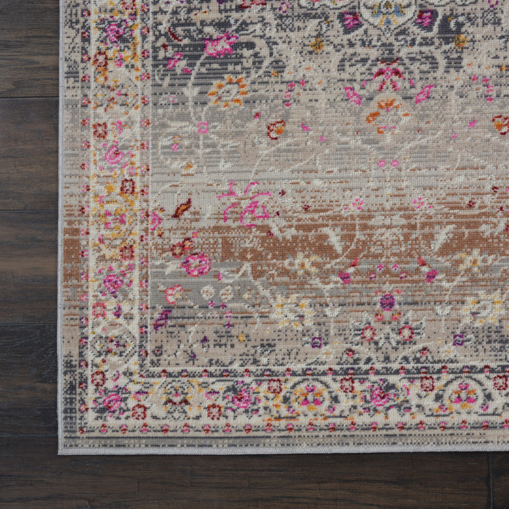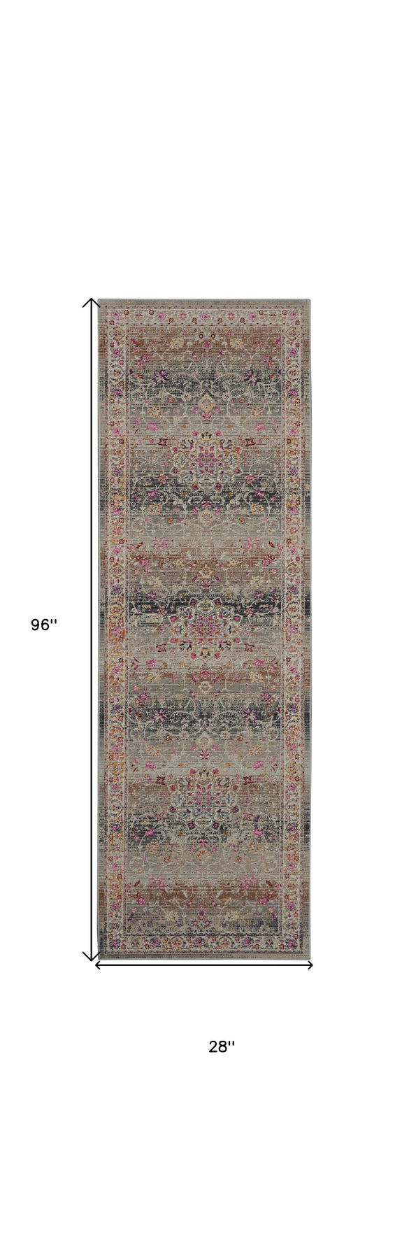 Add some artistry to your room with this 8-foot ivory brown and gray floral distressed runner rug. Ideal for spaces with kids and pets, this rug is stain resistant to help repel dirt and spilled liquids. Built to last, this rug crafted from polypropylene fibers is known for its durability and long lasting appeal. Rugs are a great way to showcase your style, hide imperfections, warm your home and reduce noise. This rectangular shaped rug features a abstract design that will add a functional and decorative accent to your space. This transitional style runner makes a great accent for the hallway, in front of cabinets, in the laundry room, or any other space you need a narrow and long rug. 28-inch h x 96-inch w x 0.5-inch d.