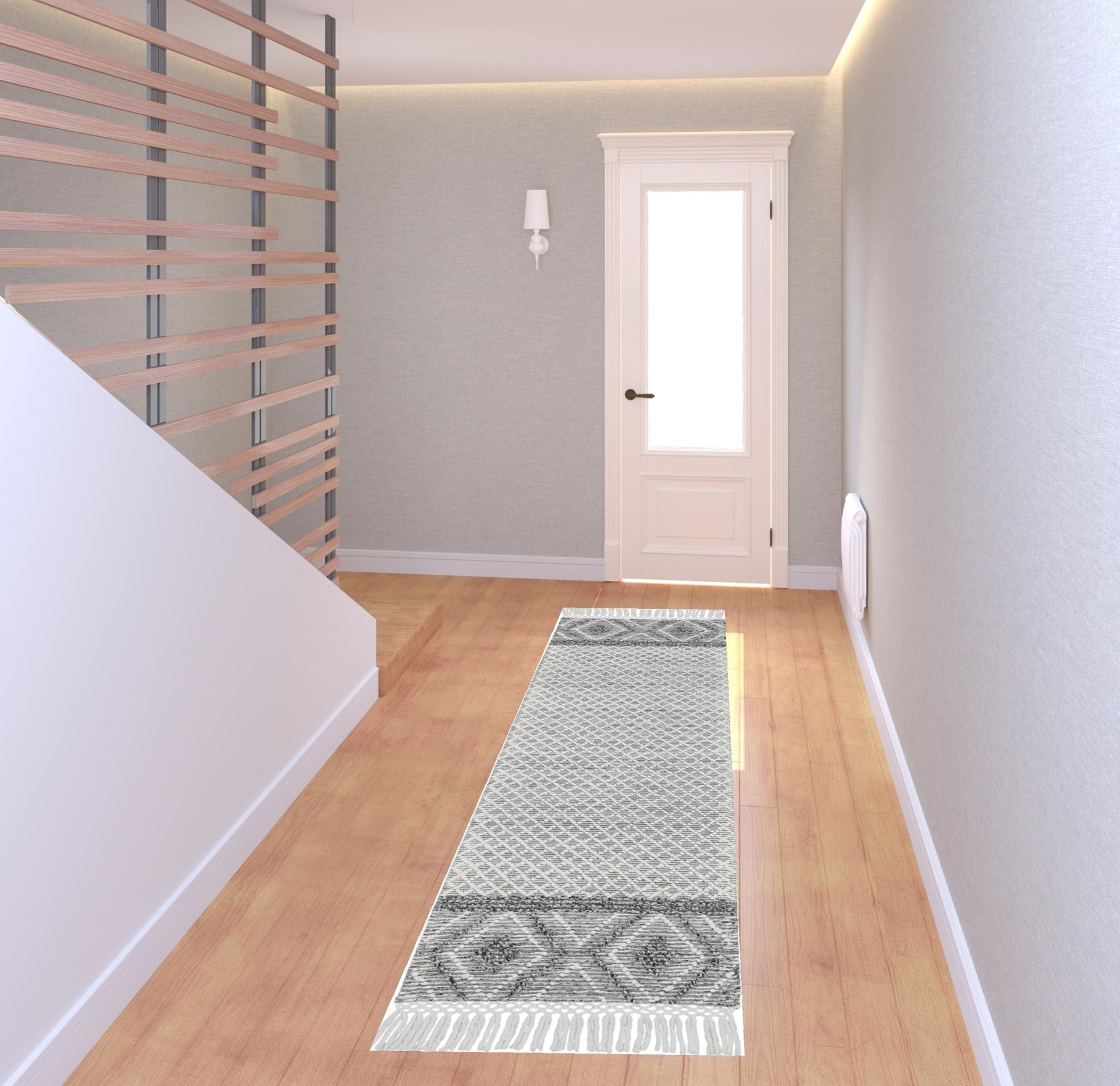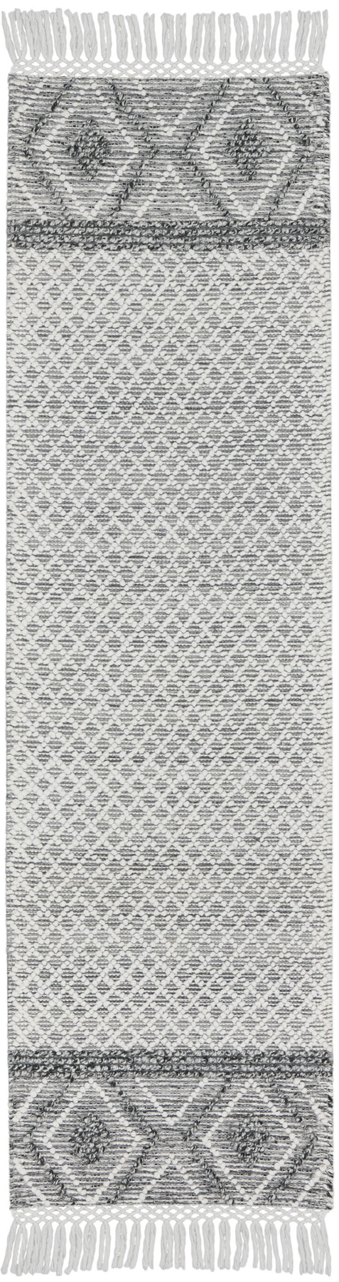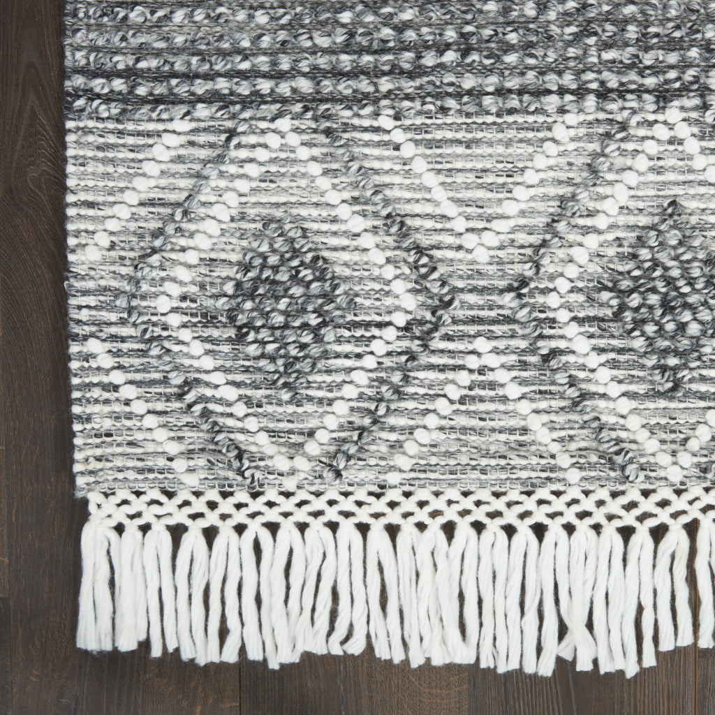 Add some artistry to your room with this 8-foot gray and ivory geometric hand woven runner rug with fringe. This runner shaped rug features a geometric design in gray and ivory to give it visual interest. A classic shape marries with good looking design for your space Tassel ends bring a timeless and fashionable look to your interior. Crafted by skilled artisans, this hand woven rug is genuine and unique. No two will be exactly alike. Area Rugs help to give warmth and sense of home to your space. .50-inch H x 27.00-inch W x 96.00-inch D