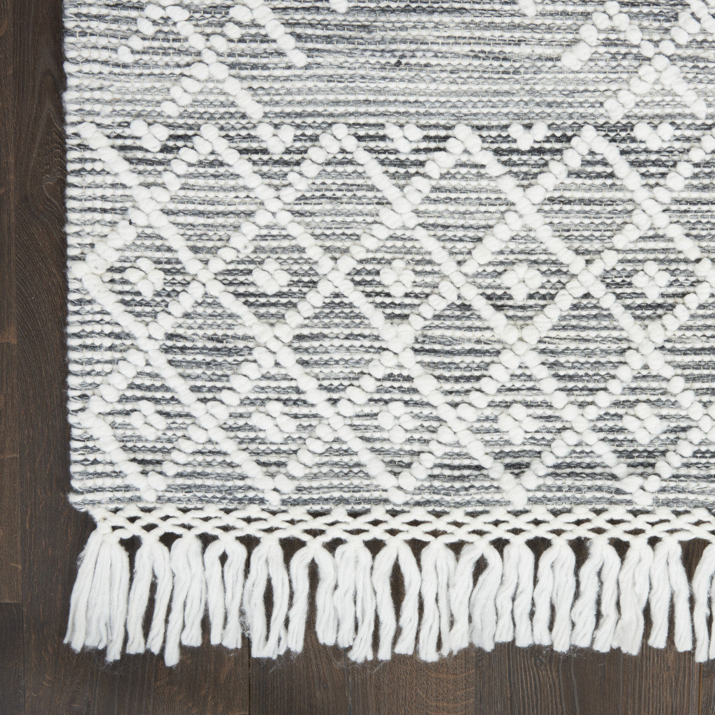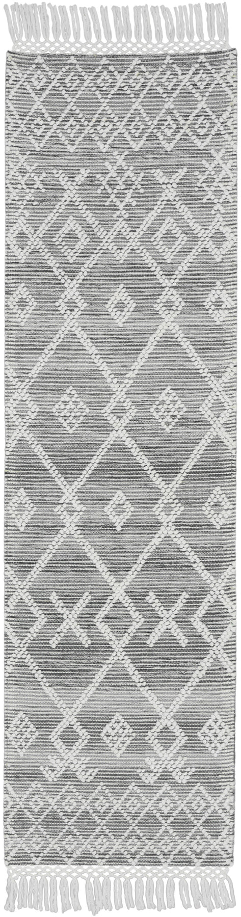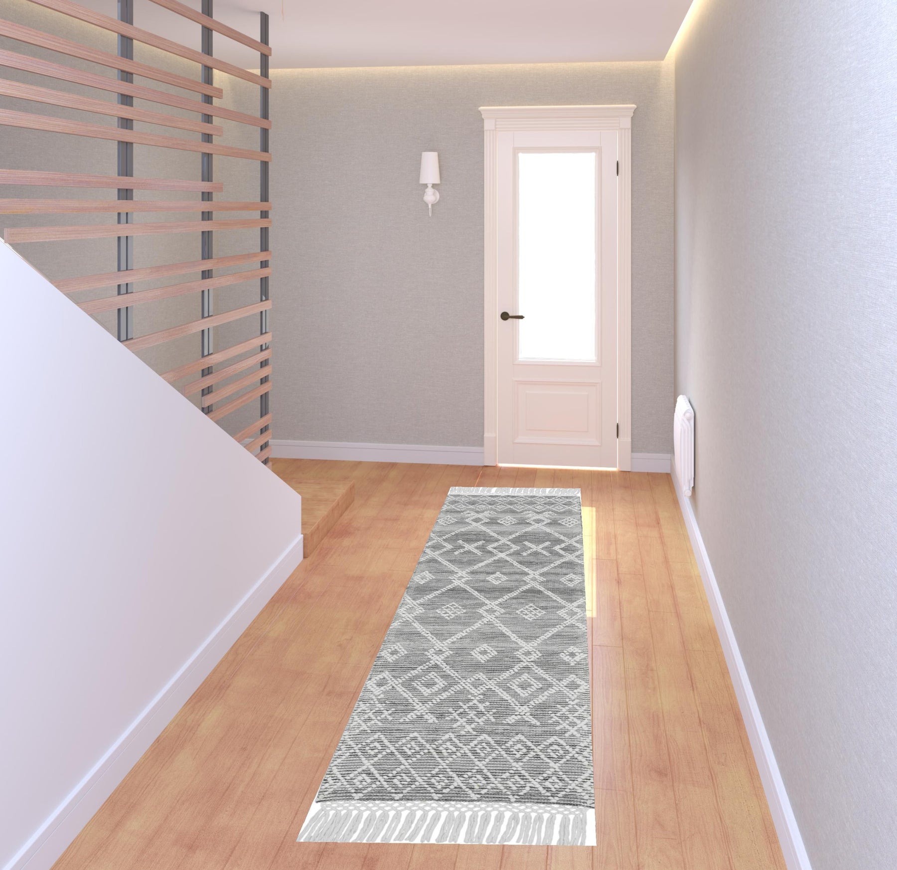Set an inviting tone in your space with this 8-foot gray and ivory geometric hand woven runner rug with fringe. This runner shaped rug features a geometric design in gray and ivory to give it visual interest. A classic shape marries with good looking design for your space Tassel ends bring a timeless and fashionable look to your interior. Crafted by skilled artisans, this hand woven rug is genuine and unique. No two will be exactly alike. Place this area rug against a hardwood or tile floor and it will enliven your living space with style and sophistication. .50-inch H x 27.00-inch W x 96.00-inch D
