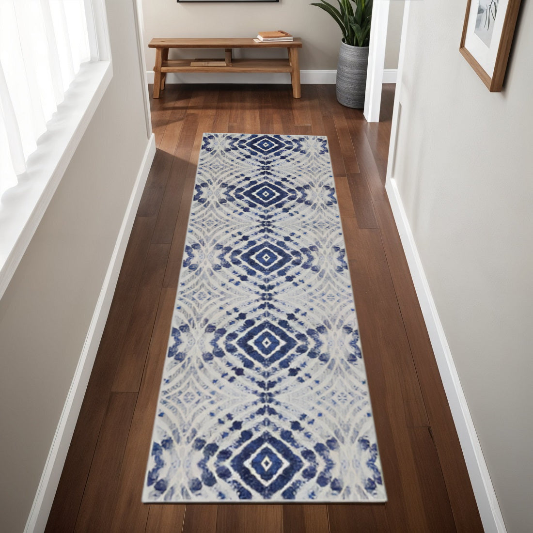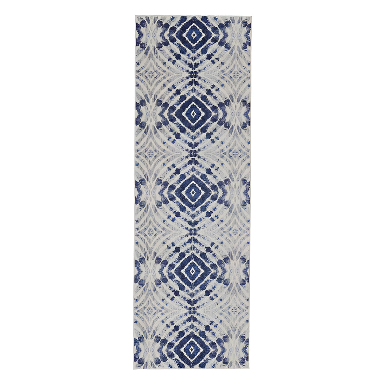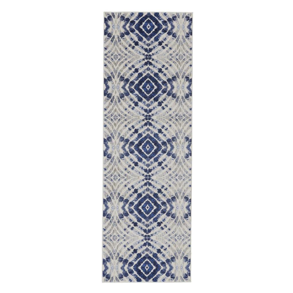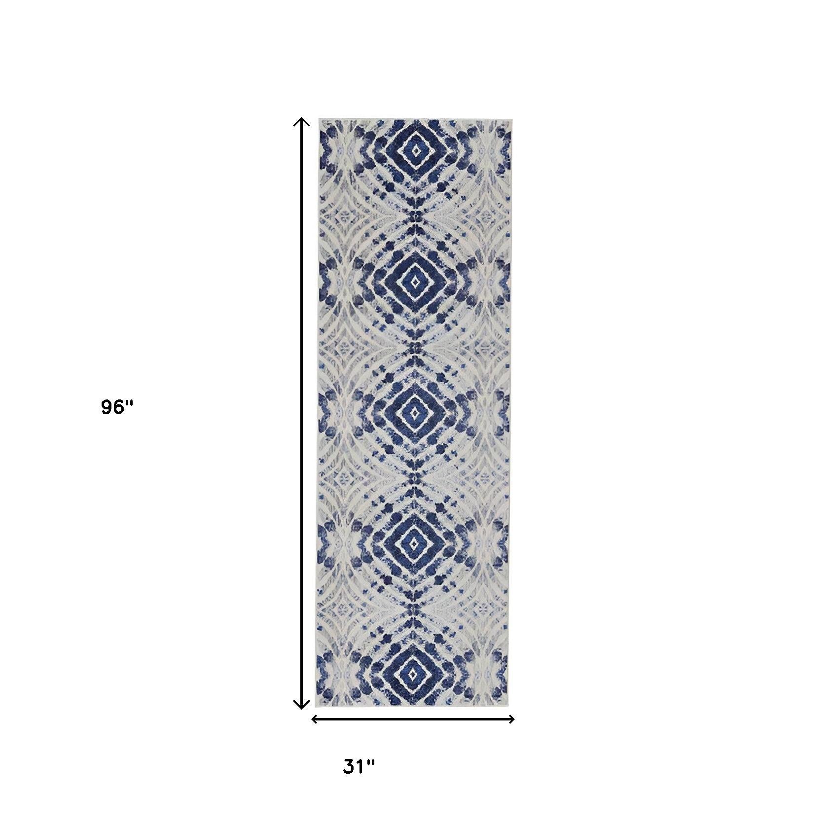 Set an inviting tone in your space with this 8' ivory blue and gray abstract distressed stain resistant runner rug. This runner shaped rug features a abstract design in ivory blue and gray to give it visual interest. A classic shape marries with good looking design for your space Made in Turkey, this rug offers high quality combined with good looking designer sensibilities. Ideal for spaces with kids and pets, this rug is stain resistant to help repel stains and spilled liquids. Area Rugs help to give warmth and sense of home to your space. 0.41" H x 31" W x 96" D
