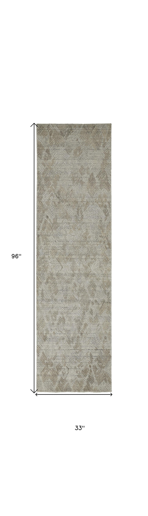 This 8' gray and taupe abstract hand woven runner rug, is a great way to add warmth to a room. This runner shaped rug features a abstract design in gray and taupe to give it visual interest. A classic shape marries with good looking design for your space Crafted by skilled artisans, this hand woven rug is genuine and unique. No two will be exactly alike. Area Rugs help to give warmth and sense of home to your space. 0.4" H x 33" W x 96" D