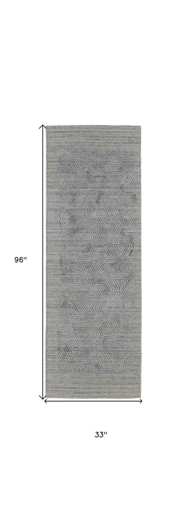 Set an inviting tone in your space with this 8-foot gray and blue abstract hand woven runner rug. This runner shaped rug features a abstract design in gray and blue to give it visual interest. A classic shape marries with good looking design for your space crafted by skilled artisans, this hand woven rug is genuine and unique. No two will be exactly alike. 33-inch H x 96-inch W x 0.4-inch D