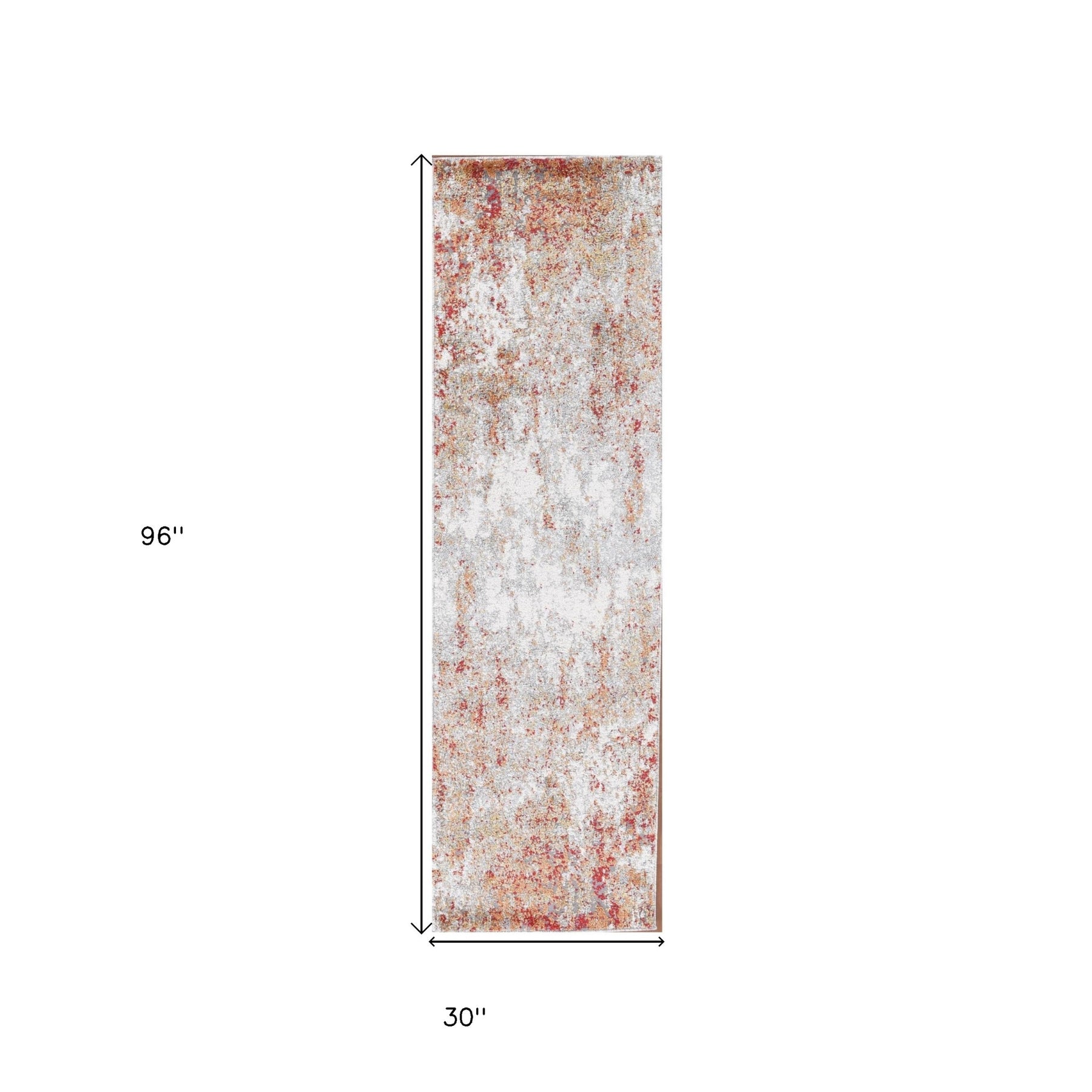 Add great coloration and comfortable texture to your space with this 8-foot ivory red and cream abstract runner rug. Built to last, this rug crafted from polyester fibers is known for its durability and long lasting appeal. Rugs are a great way to showcase your style, hide imperfections, warm your home and reduce noise. This rectangular shaped rug features a abstract design that will add a functional and decorative accent to your space. This modern style runner makes a great accent for the hallway, in front of cabinets, in the laundry room, or any other space you need a narrow and long rug. 30-inch h x 96-inch w x 0.4-inch d.