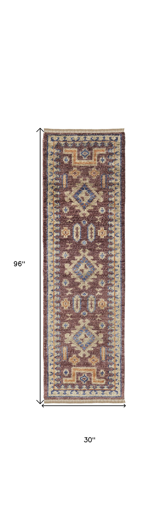 Add great coloration and comfortable texture to your space with this 8-foot blue red and tan wool geometric hand knotted runner rug with fringe. Crafted by skilled artisans, this hand knotted rug is genuine and unique. No two will be exactly alike. This runner shaped rug features a geometric design that will add a functional and decorative accent to your space. Ideal for spaces with kids and pets, this rug is stain resistant to help repel dirt and spilled liquids. Tassel ends bring a timeless and fashionable look to your interior. This smaller sized rug is just what you need for your walkway, or in front of door, cabinet, refrigerator, or chair. 30-inch h x 96-inch w x 0.4-inch d