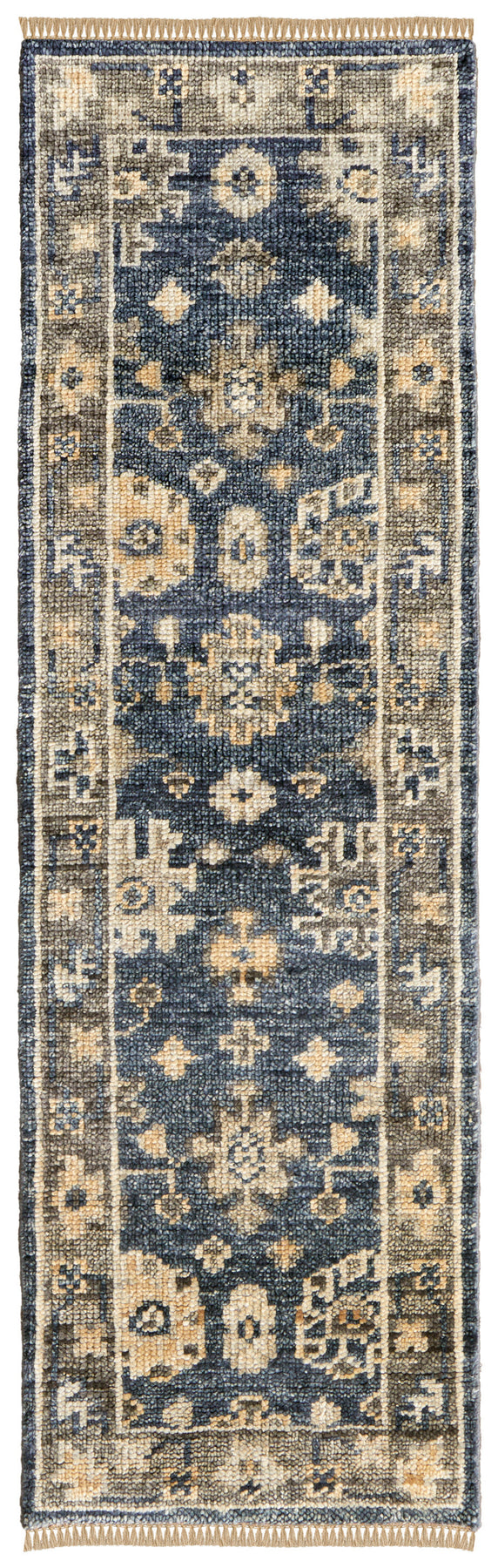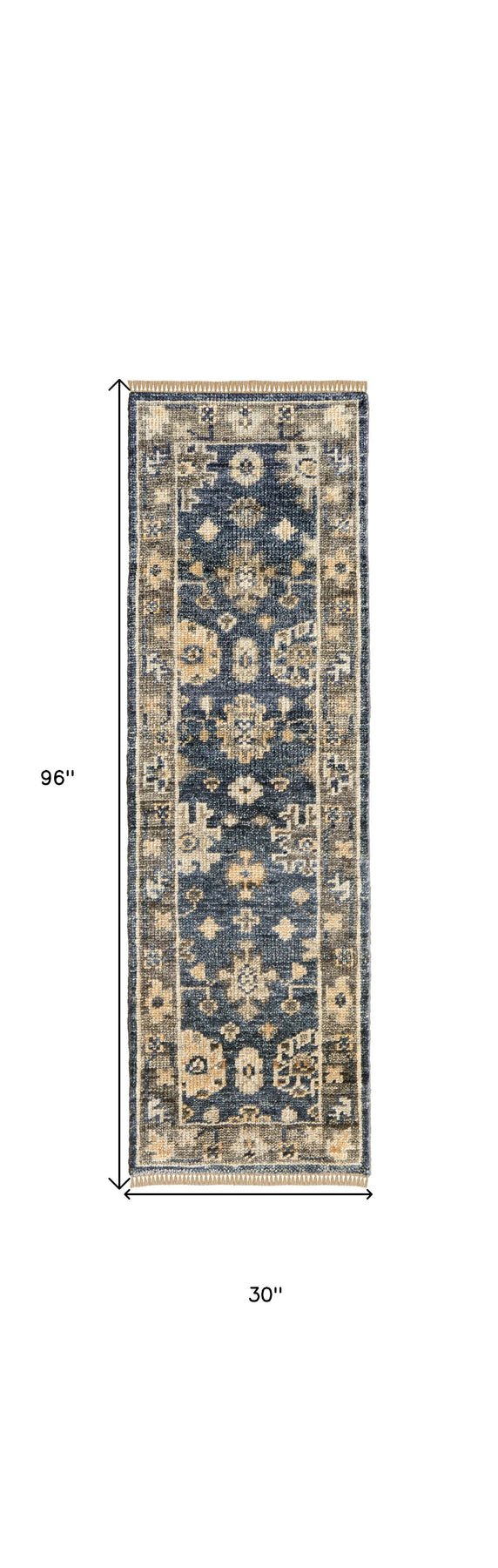 Add some artistry to your room with this 8-foot blue and gray wool floral hand knotted runner rug with fringe. This runner shaped rug features a floral design in blue and gray to give it visual interest. A classic shape marries with good looking design for your space ideal for spaces with kids and pets, this rug is stain resistant to help repel stains and spilled liquids. Tassel ends bring a timeless and fashionable look to your interior. Crafted by skilled artisans, this hand knotted rug is genuine and unique. No two will be exactly alike. Place this area rug against a hardwood or tile floor and it will enliven your living space with style and sophistication. 30-inch H x 96-inch W x 0.4-inch D