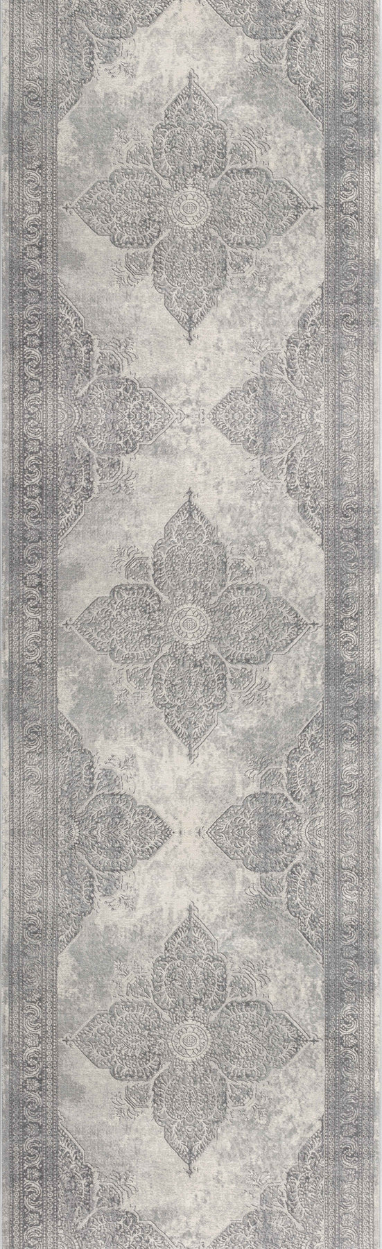 Wrapped in simplicity with traditional motifs and modern hues, this Gray Distressed Medallion Runner Rug will serve as a classic accent to complement the aesthetics of your home. The four-petaled floral medallion in the center is extravagantly detailed in gray with a richly decorative border all-around lying over a distressed dove gray base. Made in Turkey with 100% polypropylene to stand the test of durability and resist stains in high traffic indoor areas. The high-low pile construction adds to a surface texture for a luxurious look with a soft and sumptuous feel under the feet. Roll this aesthetically pleasing runner rug against a dark-colored floor to let it speak through its understated elegance. 96Ó x 27Ó x 0.4Ó
