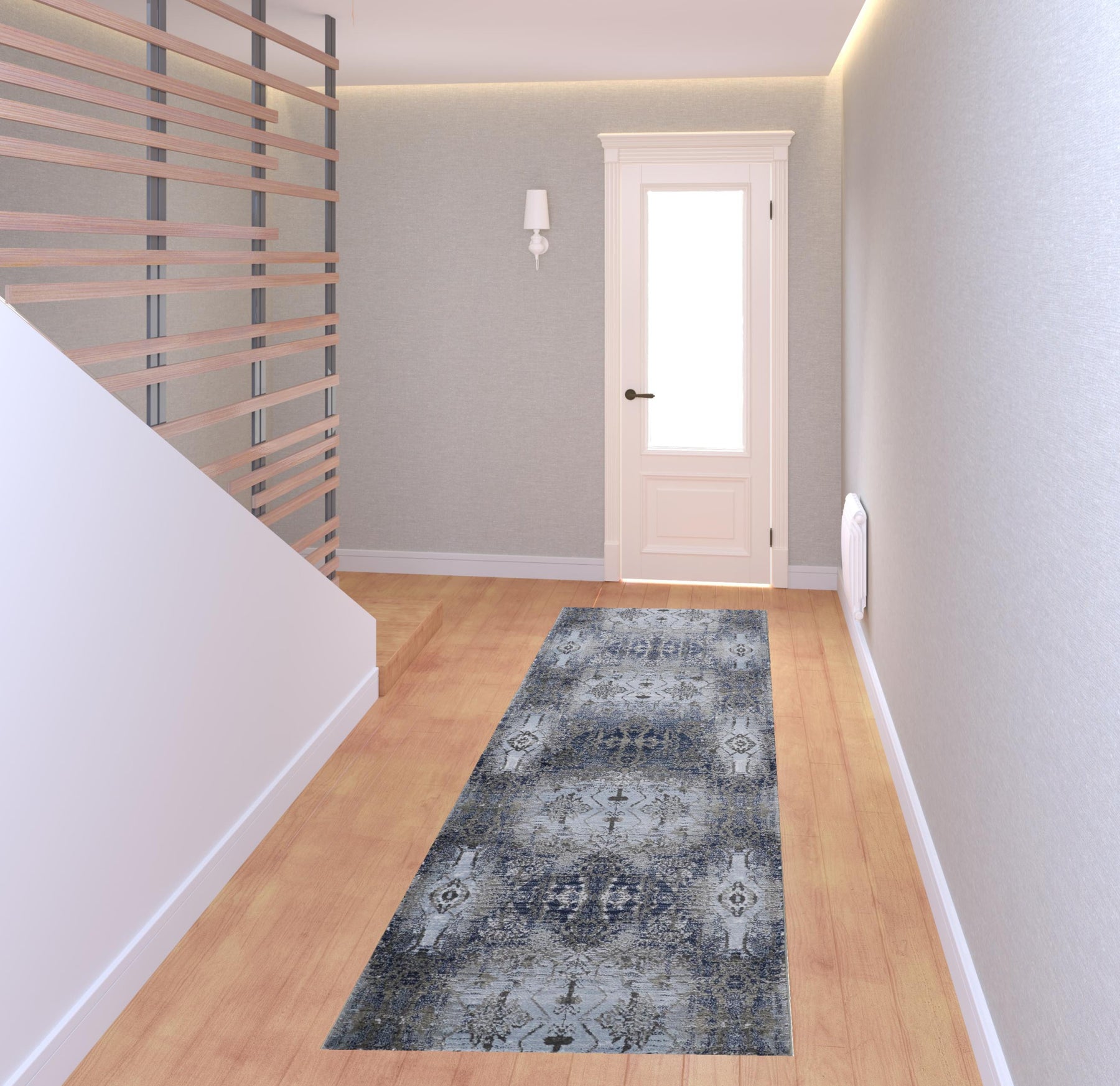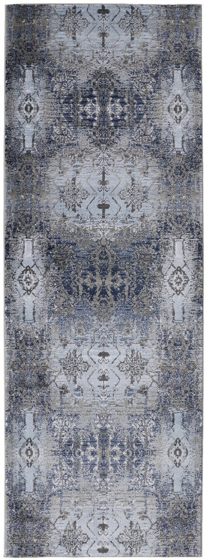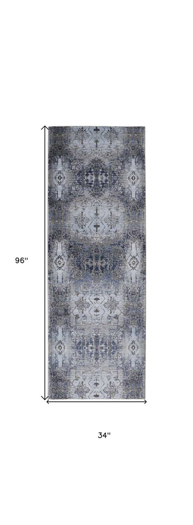 This 8' blue gray and taupe abstract stain resistant runner rug, is a great way to add warmth to a room. This runner shaped rug features a abstract design in blue gray and taupe to give it visual interest. A classic shape marries with good looking design for your space This superior Turkish rug represents the highest quality and is built to last. Ideal for spaces with kids and pets, this rug is stain resistant to help repel stains and spilled liquids. Place this area rug against a hardwood or tile floor and it will enliven your living space with style and sophistication. 0.39" H x 34" W x 96" D