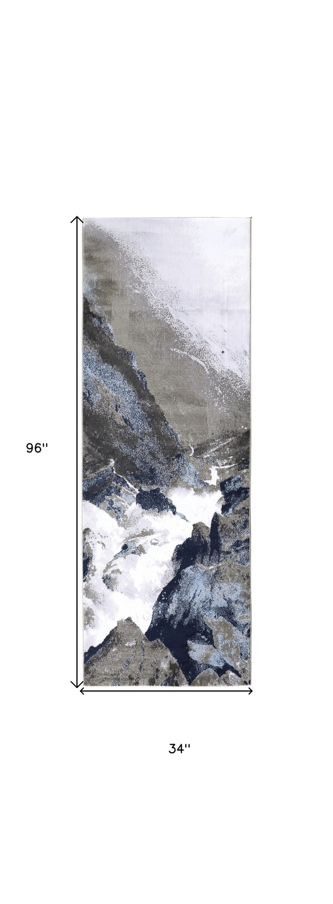 Set an inviting tone in your space with this 8' blue gray and white abstract stain resistant runner rug. This runner shaped rug features a abstract design in blue gray and white to give it visual interest. A classic shape marries with good looking design for your space This superior Turkish rug represents the highest quality and is built to last. Ideal for spaces with kids and pets, this rug is stain resistant to help repel stains and spilled liquids. Area Rugs help to give warmth and sense of home to your space. 0.39" H x 34" W x 96" D