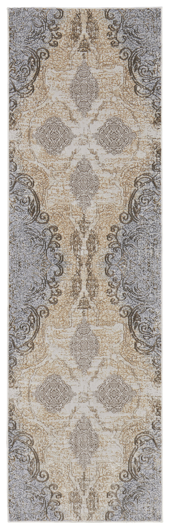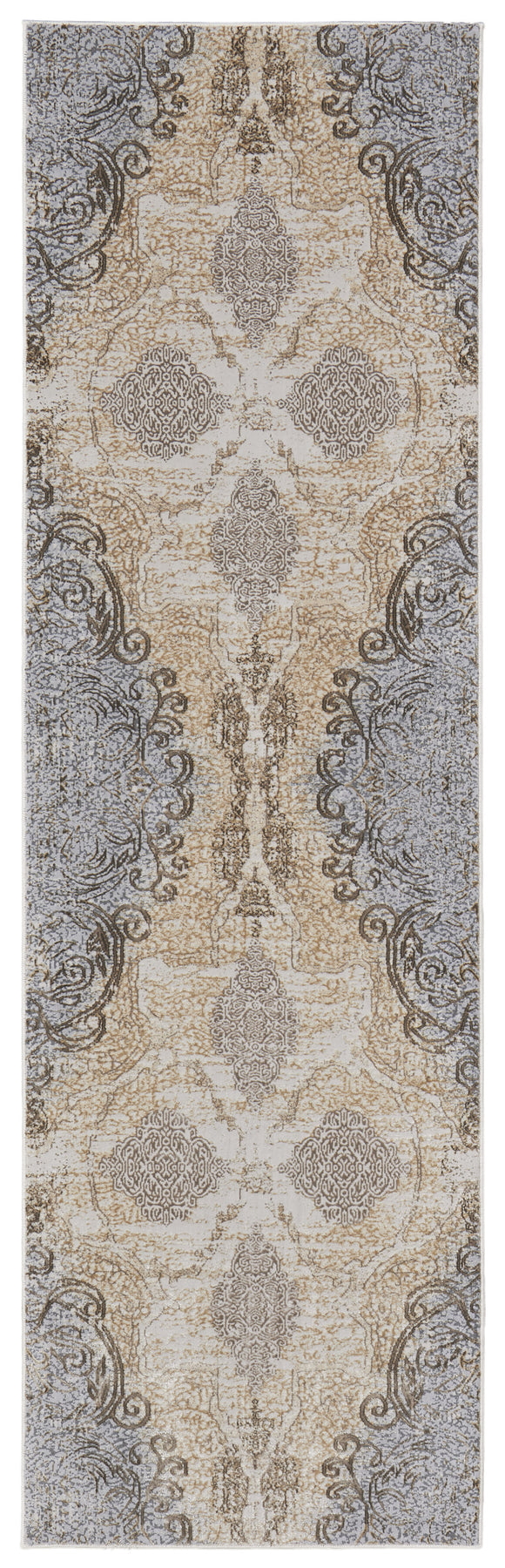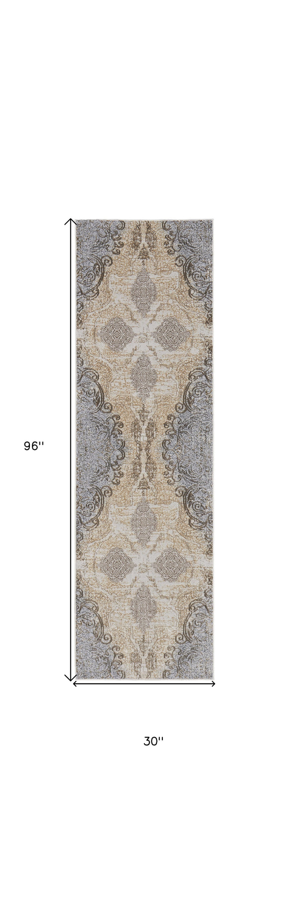 Set an inviting tone in your space with this 8-foot gray and brown medallion power loom distressed runner rug. This runner shaped rug features a medallion design that will add a functional and decorative accent to your space. This smaller sized rug is just what you need for your walkway, or in front of door, cabinet, refrigerator, or chair. 30-inch h x 96-inch w x 0.39-inch d