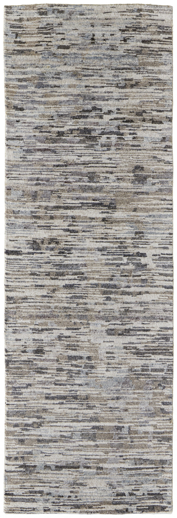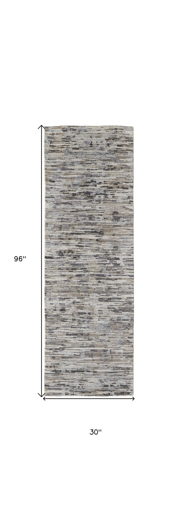Add some artistry to your room with this 8' gray blue and silver wool abstract hand knotted runner rug. This runner shaped rug features a abstract design in gray blue and silver to give it visual interest. A classic shape marries with good looking design for your space Crafted by skilled artisans, this hand knotted rug is genuine and unique. No two will be exactly alike. Area Rugs help to give warmth and sense of home to your space. 0.39" H x 30" W x 96" D