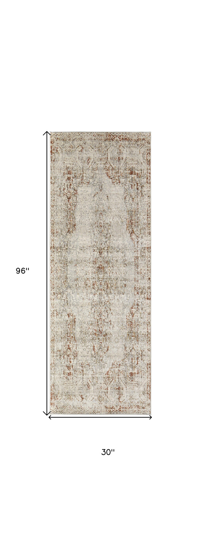 Set an inviting tone in your space with this 8-foot ivory gray and brown abstract power loom worn faded runner rug with fringe. This runner shaped rug features a abstract design in ivory gray and brown to give it visual interest. A classic shape marries with good looking design for your space tassel ends bring a timeless and fashionable look to your interior. Place this area rug against a hardwood or tile floor and it will enliven your living space with style and sophistication. 30-inch H x 96-inch W x 0.39-inch D