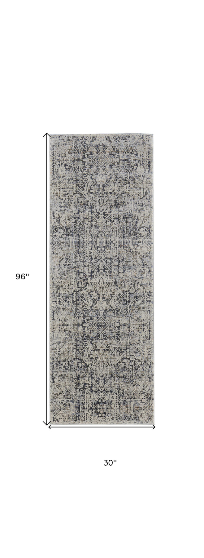 Set an inviting tone in your space with this 8-foot ivory and gray abstract power loom worn faded runner rug with fringe. This runner shaped rug features a abstract design that will add a functional and decorative accent to your space. Tassel ends bring a timeless and fashionable look to your interior. This smaller sized rug is just what you need for your walkway, or in front of door, cabinet, refrigerator, or chair. 30-inch h x 96-inch w x 0.39-inch d