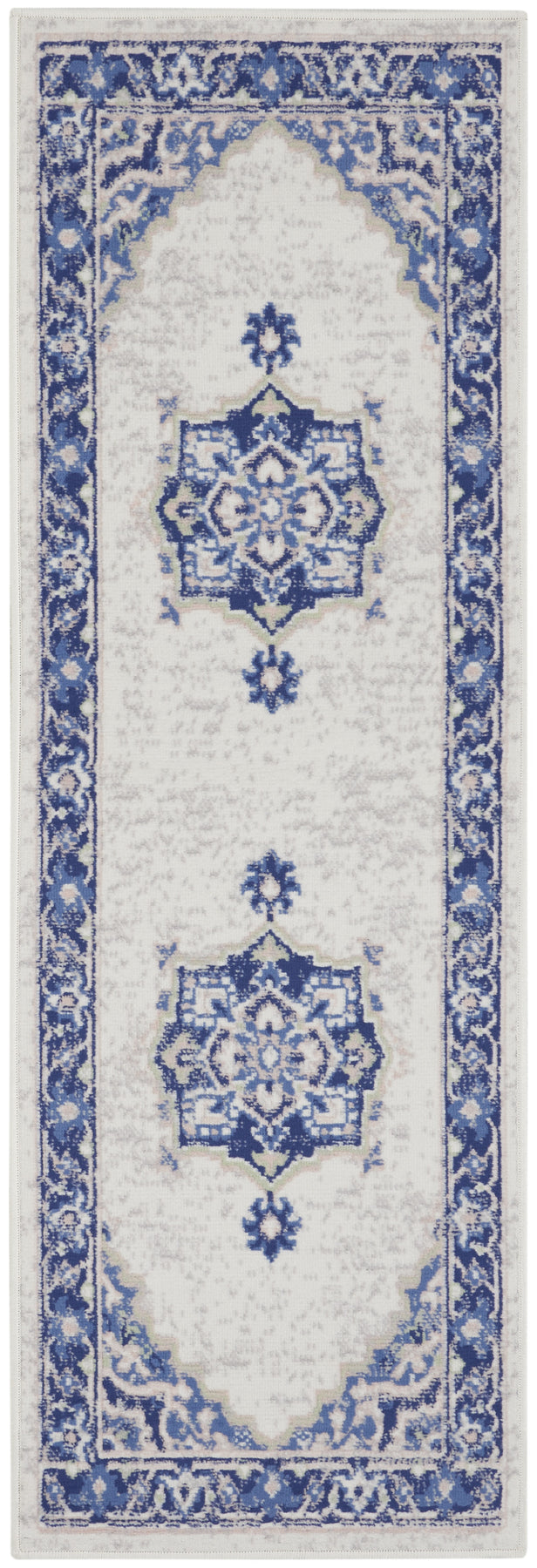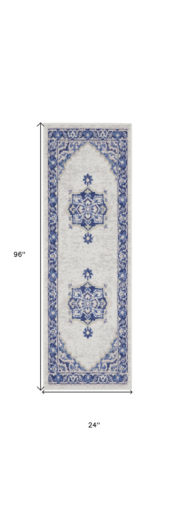 Add great coloration and comfortable texture to your space with this 8-foot ivory and blue floral medallion distressed non skid runner rug. Ideal for spaces with kids and pets, this rug is stain resistant to help repel dirt and spilled liquids. Built to last, this rug crafted from polyester fibers is known for its durability and long lasting appeal. Rugs are a great way to showcase your style, hide imperfections, warm your home and reduce noise. This rectangular shaped rug features a abstract design that will add a functional and decorative accent to your space. This cottage styled runners makes a great accent for the hallway, in front of cabinets, in the laundry room, or any other space you need a narrow and long rug. 24-inch h x 96-inch w x 0.39-inch d.