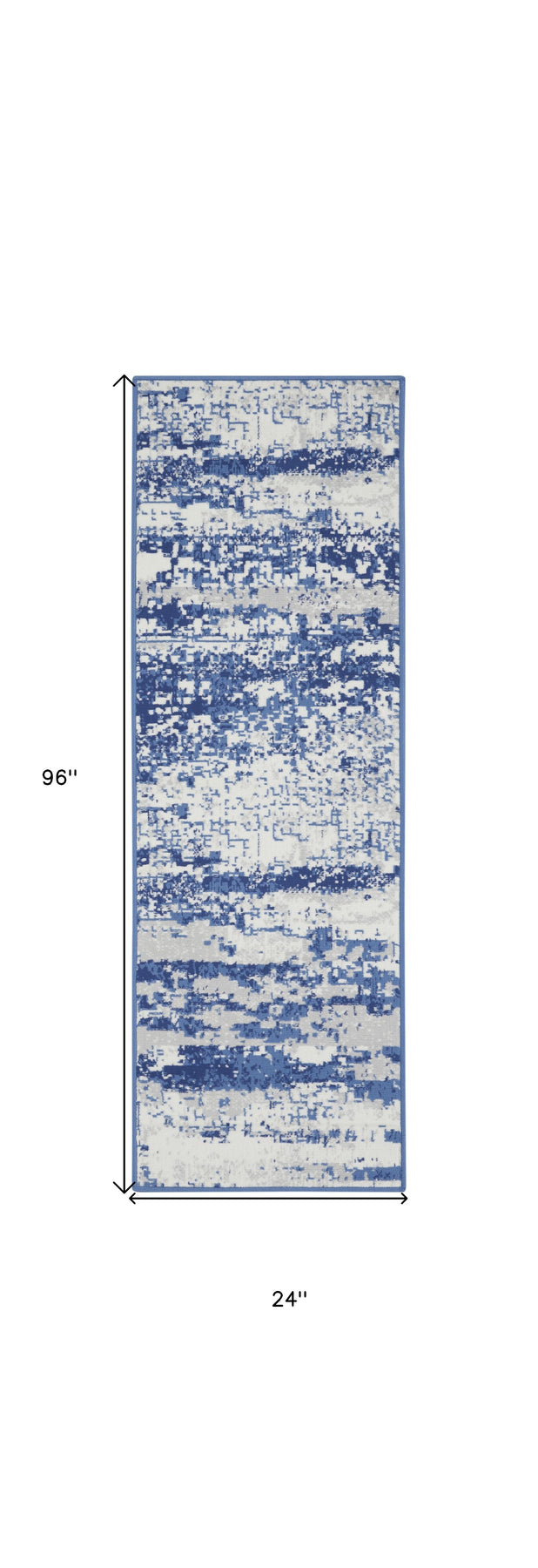 Set an inviting tone in your space with this 8-foot ivory and navy blue abstract distressed non skid runner rug. Ideal for spaces with kids and pets, this rug is stain resistant to help repel dirt and spilled liquids. Built to last, this rug crafted from polypropylene fibers is known for its durability and long lasting appeal. Rugs are a great way to showcase your style, hide imperfections, warm your home and reduce noise. This rectangular shaped rug features a abstract design that will add a functional and decorative accent to your space. This modern styled runners makes a great accent for the hallway, in front of cabinets, in the laundry room, or any other space you need a narrow and long rug. 24-inch h x 96-inch w x 0.39-inch d.