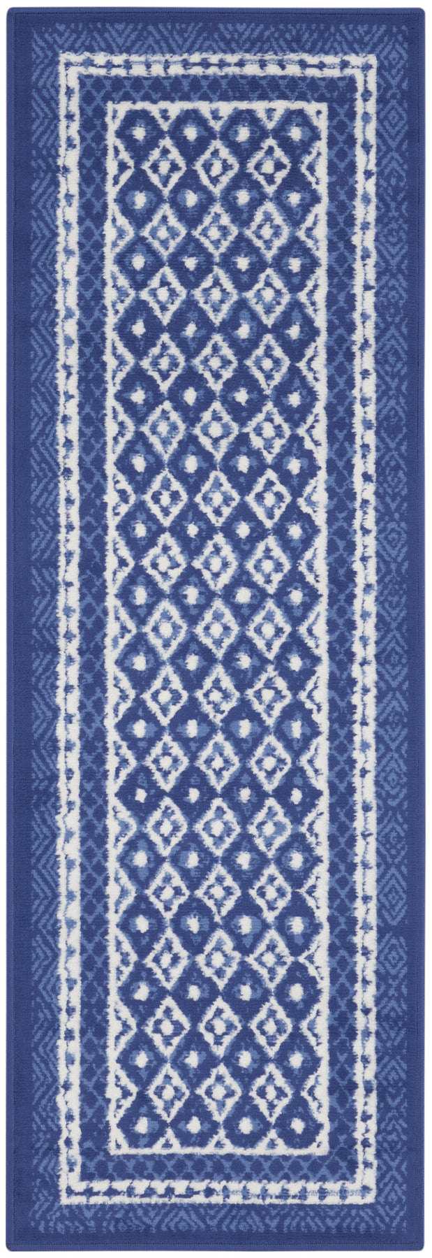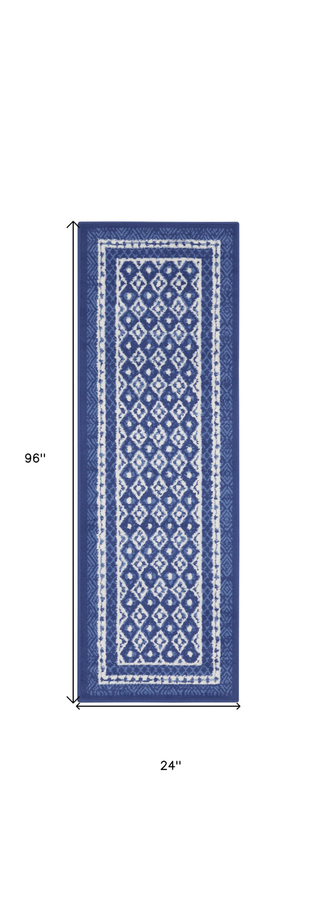 This 8-foot ivory and navy blue geometric distressed non skid runner rug, is a great way to add warmth to a room. Ideal for spaces with kids and pets, this rug is stain resistant to help repel dirt and spilled liquids. Built to last, this rug crafted from polypropylene fibers is known for its durability and long lasting appeal. Rugs are a great way to showcase your style, hide imperfections, warm your home and reduce noise. This rectangular shaped rug features a abstract design that will add a functional and decorative accent to your space. This cottage styled runners makes a great accent for the hallway, in front of cabinets, in the laundry room, or any other space you need a narrow and long rug. 24-inch h x 96-inch w x 0.39-inch d.