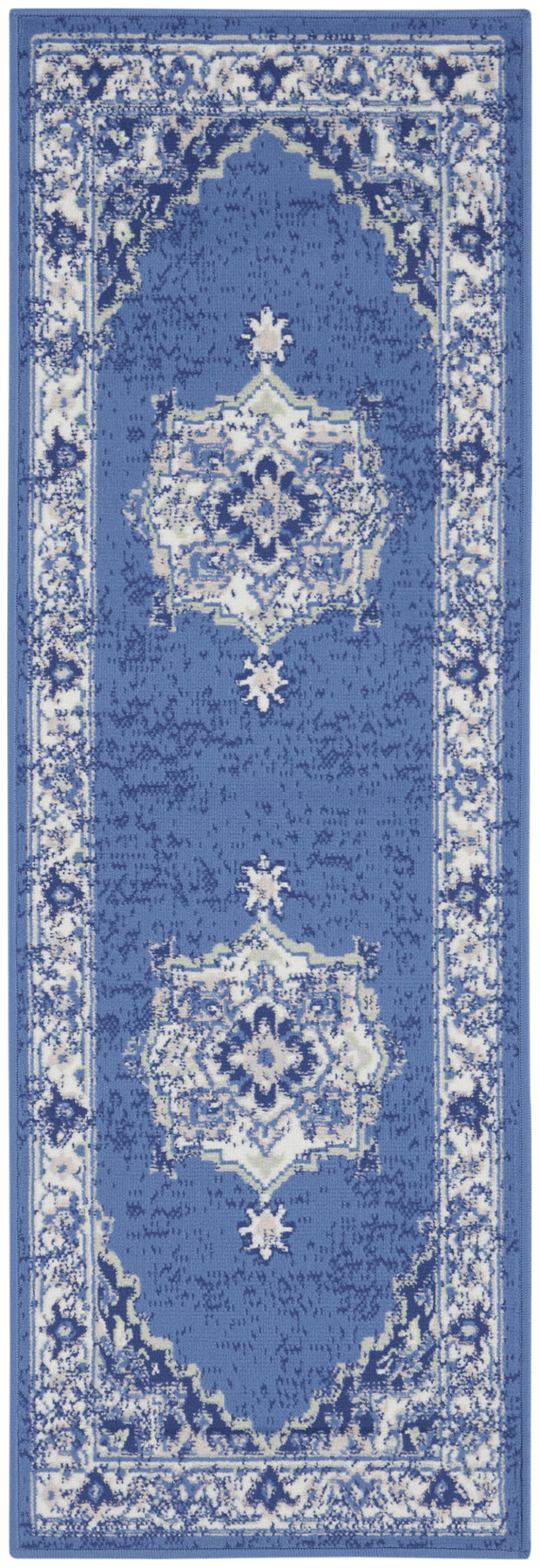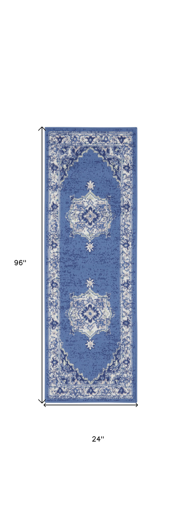 Add some artistry to your room with this 8-foot ivory navy blue and beige floral medallion distressed non skid runner rug. Ideal for spaces with kids and pets, this rug is stain resistant to help repel dirt and spilled liquids. Built to last, this rug crafted from polypropylene fibers is known for its durability and long lasting appeal. Rugs are a great way to showcase your style, hide imperfections, warm your home and reduce noise. This rectangular shaped rug features a abstract design that will add a functional and decorative accent to your space. This cottage styled runners makes a great accent for the hallway, in front of cabinets, in the laundry room, or any other space you need a narrow and long rug. 24-inch h x 96-inch w x 0.39-inch d.