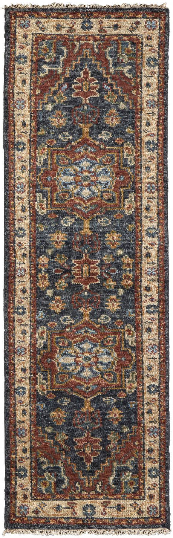 Add great coloration and comfortable texture to your space with this 8-foot red black and ivory wool floral hand knotted stain resistant runner rug. Crafted by skilled artisans, this hand knotted rug is genuine and unique. No two will be exactly alike. This runner shaped rug features a floral design that will add a functional and decorative accent to your space. Ideal for spaces with kids and pets, this rug is stain resistant to help repel dirt and spilled liquids. This smaller sized rug is just what you need for your walkway, or in front of door, cabinet, refrigerator, or chair. 30-inch h x 96-inch w x 0.32-inch d