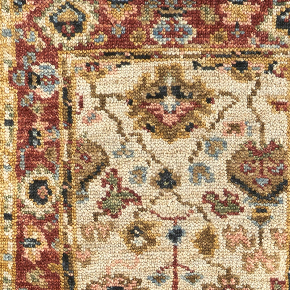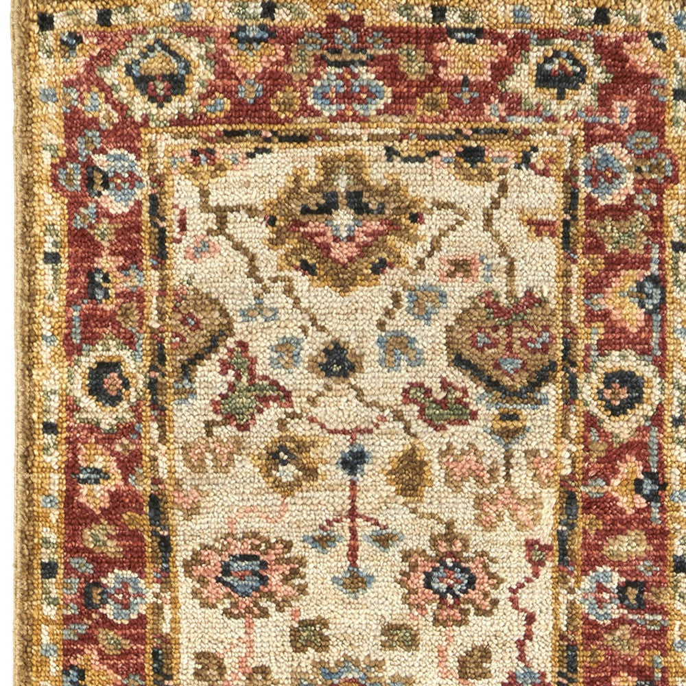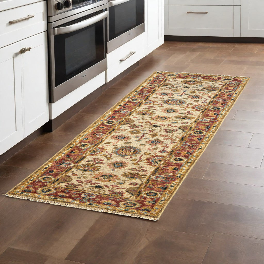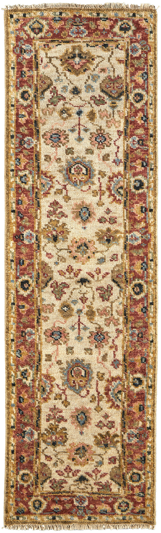 Add some artistry to your room with this 8' ivory red and blue wool floral hand knotted stain resistant runner rug. This runner shaped rug features a floral design in ivory red and blue to give it visual interest. A classic shape marries with good looking design for your space Ideal for spaces with kids and pets, this rug is stain resistant to help repel stains and spilled liquids. Crafted by skilled artisans, this hand knotted rug is genuine and unique. No two will be exactly alike. Area Rugs help to give warmth and sense of home to your space. 0.32" H x 30" W x 96" D
