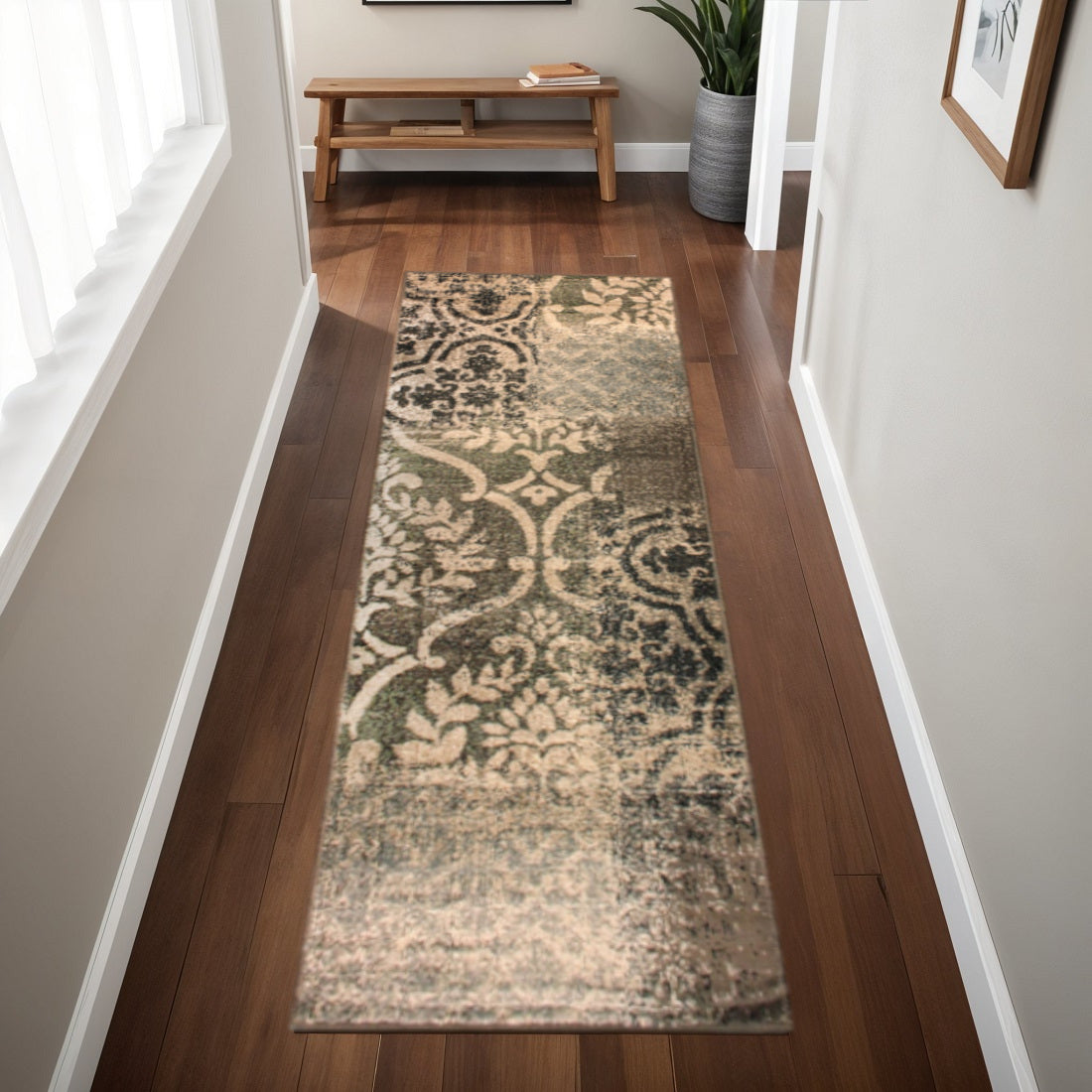 This 8' ivory-light blue damask distressed stain resistant runner rug, is a great way to add warmth to a room. This runner shaped rug features a damask design in ivory-light blue to give it visual interest. A classic shape marries with good looking design for your space Ideal for spaces with kids and pets, this rug is stain resistant to help repel stains and spilled liquids. Place this area rug against a hardwood or tile floor and it will enliven your living space with style and sophistication. 0.31" H x 32.4" W x 96" D