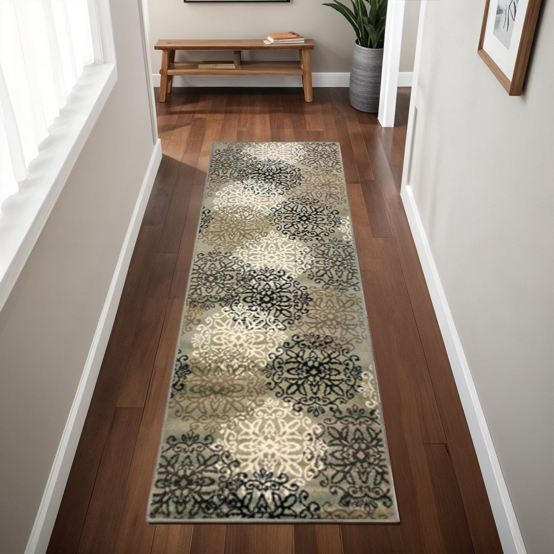 Add great coloration and comfortable texture to your space with this 8' blue and gray medallion power loom stain resistant runner rug. This runner shaped rug features a medallion design in blue and gray to give it visual interest. A classic shape marries with good looking design for your space Made in Turkey, this rug offers high quality combined with good looking designer sensibilities. Ideal for spaces with kids and pets, this rug is stain resistant to help repel stains and spilled liquids. Area Rugs help to give warmth and sense of home to your space. 0.31" H x 32.4" W x 96" D