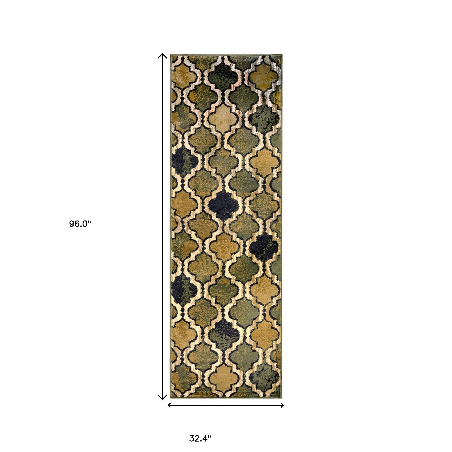 Set an inviting tone in your space with this 8' green quatrefoil power loom distressed stain resistant runner rug. This runner shaped rug features a quatrefoil design in green to give it visual interest. A classic shape marries with good looking design for your space This superior Turkish rug represents the highest quality and is built to last. Ideal for spaces with kids and pets, this rug is stain resistant to help repel stains and spilled liquids. Place this area rug against a hardwood or tile floor and it will enliven your living space with style and sophistication. 0.31" H x 32.4" W x 96" D