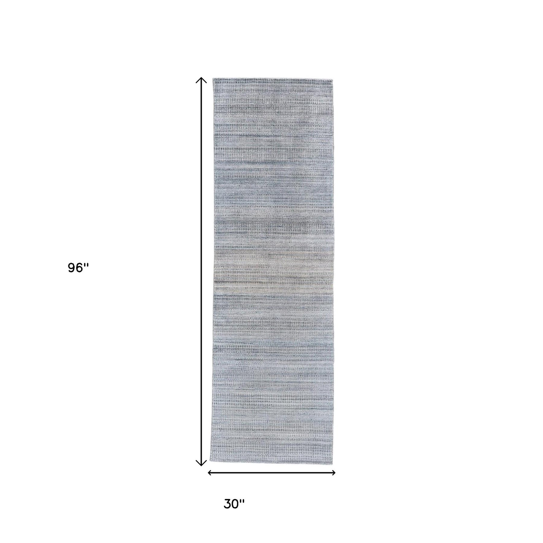 This 8-foot gray and purple ombre hand woven runner rug, is a great way to add warmth to a room. Crafted by skilled artisans, this hand woven rug is genuine and unique. No two will be exactly alike. Crafted from wool blend fibers that give this piece premium texture, refinement, and appeal. This runner shaped rug features a ombre design that will add a functional and decorative accent to your space. This smaller sized rug is just what you need for your walkway, or in front of door, cabinet, refrigerator, or chair. 30-inch h x 96-inch w x 0.31-inch d
