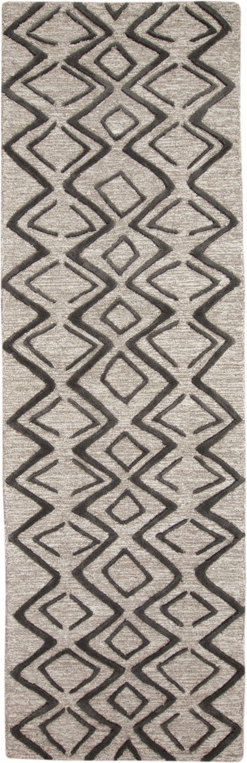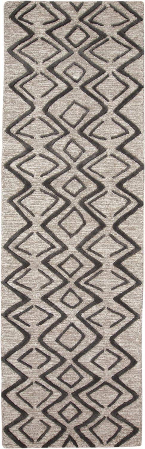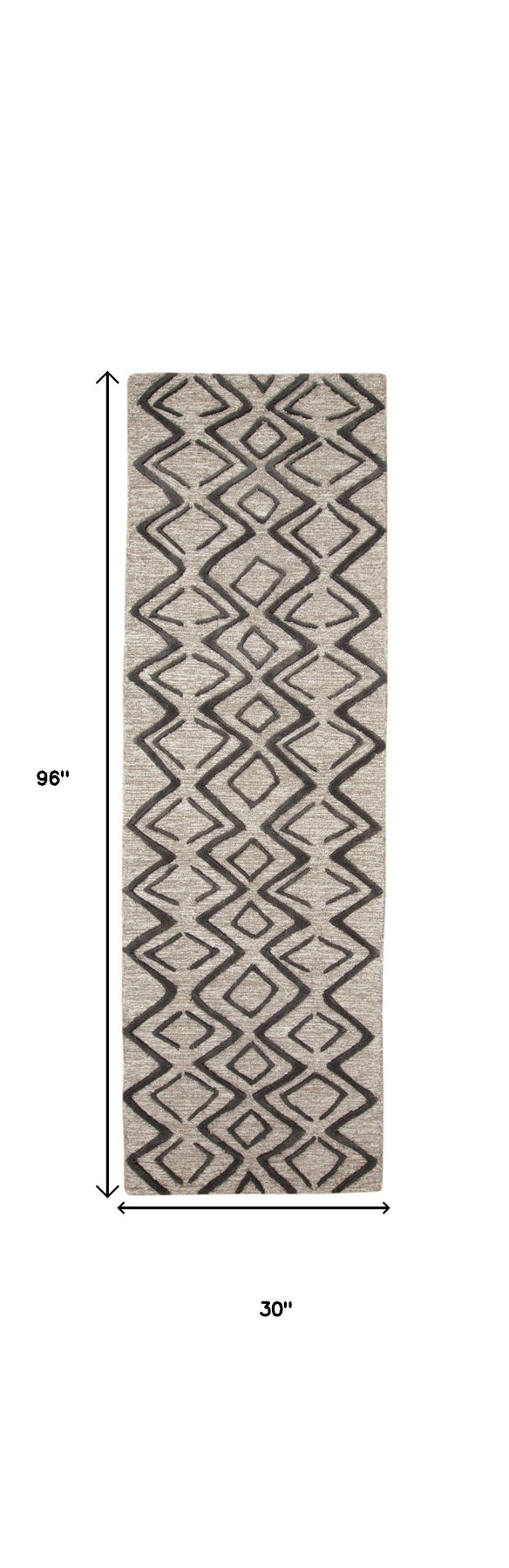 This 8-foot black and taupe geometric hand tufted runner rug, is a great way to add warmth to a room. Crafted from wool blend fibers that give this piece premium texture, refinement, and appeal. This runner shaped rug features a geometric design that will add a functional and decorative accent to your space. Ideal for spaces with kids and pets, this rug is stain resistant to help repel dirt and spilled liquids. This smaller sized rug is just what you need for your walkway, or in front of door, cabinet, refrigerator, or chair. 30-inch h x 96-inch w x 0.31-inch d