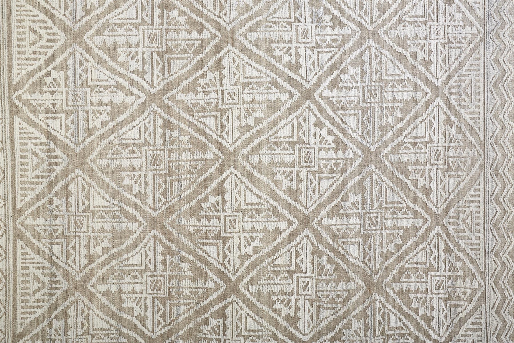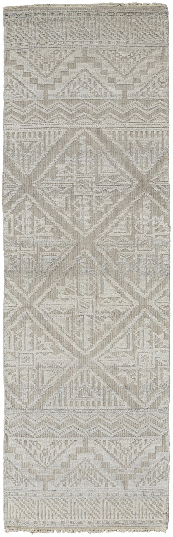 Add some artistry to your room with this 8' ivory tan and gray geometric hand knotted runner rug. This runner shaped rug features a geometric design in ivory tan and gray to give it visual interest. A classic shape marries with good looking design for your space Crafted by skilled artisans, this hand knotted rug is genuine and unique. No two will be exactly alike. Area Rugs help to give warmth and sense of home to your space. 0.31" H x 30" W x 96" D