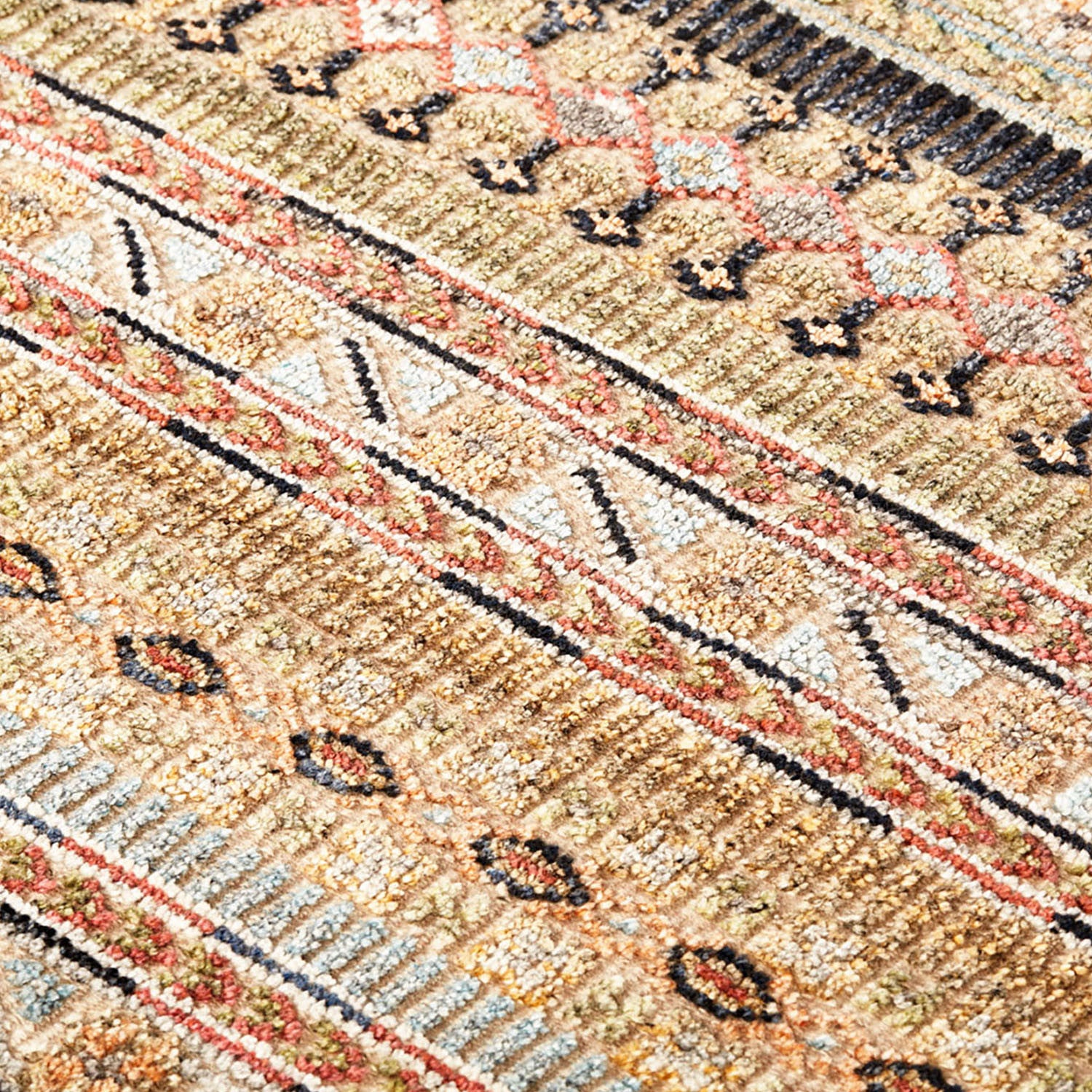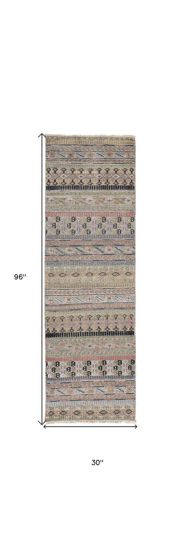Add some artistry to your room with this 8-foot tan blue and orange striped hand knotted runner rug. This runner shaped rug features a striped design in tan blue and orange to give it visual interest. A classic shape marries with good looking design for your space crafted by skilled artisans, this hand knotted rug is genuine and unique. No two will be exactly alike. Area rugs help to give warmth and sense of home to your space. 30-inch H x 96-inch W x 0.31-inch D