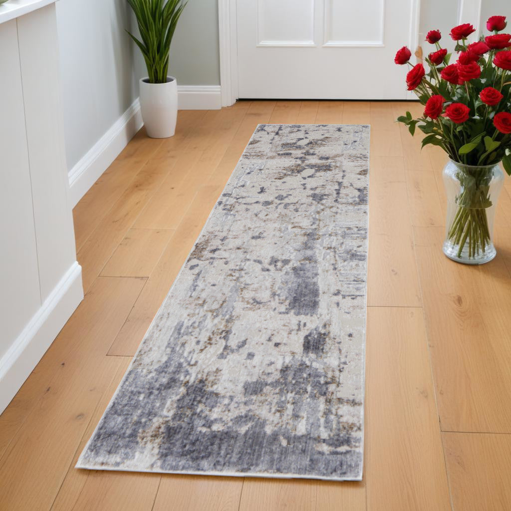 Set an inviting tone in your space with this 8-foot ivory gray and blue abstract power loom worn faded runner rug. This runner shaped rug features a abstract design that will add a functional and decorative accent to your space. Ideal for spaces with kids and pets, this rug is stain resistant to help repel dirt and spilled liquids. This smaller sized rug is just what you need for your walkway, or in front of door, cabinet, refrigerator, or chair. 36-inch h x 96-inch w x 0.28-inch d