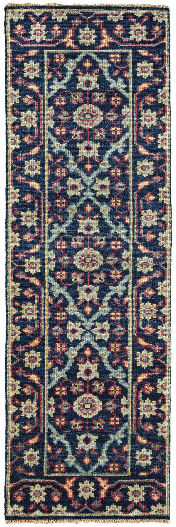 Set an inviting tone in your space with this 8-foot blue and green wool floral hand knotted distressed runner rug with fringe. This runner shaped rug features a floral design in blue and green to give it visual interest. A classic shape marries with good looking design for your space ideal for spaces with kids and pets, this rug is stain resistant to help repel stains and spilled liquids. Tassel ends bring a timeless and fashionable look to your interior. Crafted by skilled artisans, this hand knotted rug is genuine and unique. No two will be exactly alike. 30-inch H x 96-inch W x 0.28-inch D