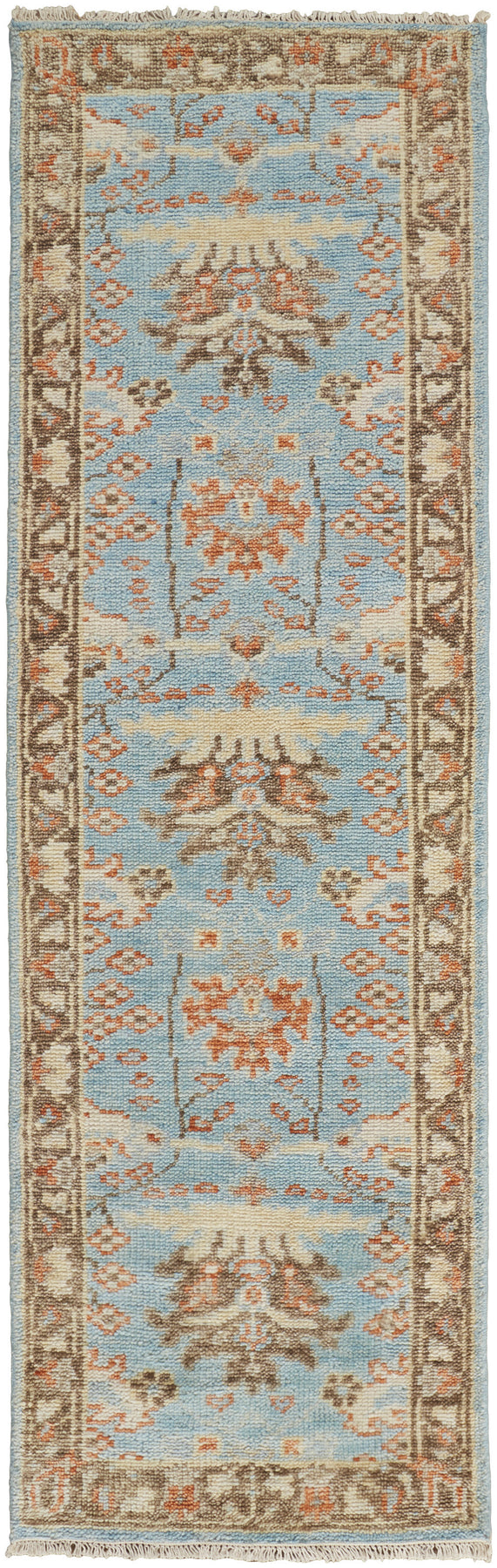 This 8-foot brown and blue wool oriental hand knotted runner rug, is a great way to add warmth to a room. This runner shaped rug features a oriental design in brown and blue to give it visual interest. A classic shape marries with good looking design for your space ideal for spaces with kids and pets, this rug is stain resistant to help repel stains and spilled liquids. Crafted by skilled artisans, this hand knotted rug is genuine and unique. No two will be exactly alike. Area rugs help to give warmth and sense of home to your space. 30-inch H x 96-inch W x 0.28-inch D