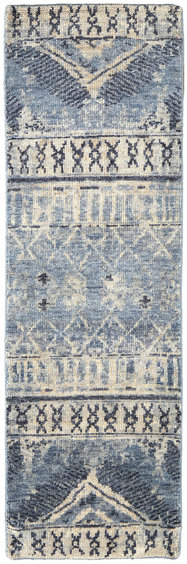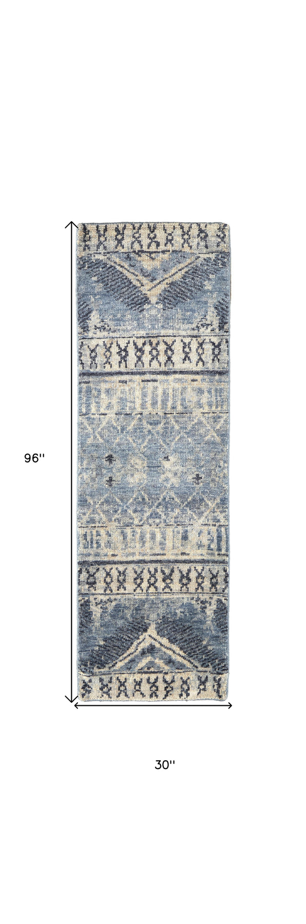 Set an inviting tone in your space with this 8-foot gray blue and ivory wool floral hand knotted runner rug. Crafted by skilled artisans, this hand knotted rug is genuine and unique. No two will be exactly alike. This runner shaped rug features a floral design that will add a functional and decorative accent to your space. Ideal for spaces with kids and pets, this rug is stain resistant to help repel dirt and spilled liquids. This smaller sized rug is just what you need for your walkway, or in front of door, cabinet, refrigerator, or chair. 30-inch h x 96-inch w x 0.28-inch d