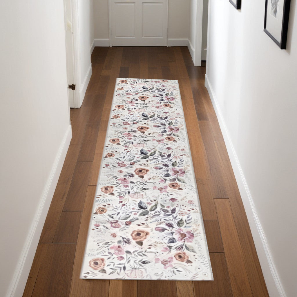 Add some artistry to your room with this 8-foot ivory floral washable runner rug. Rugs are a great way to showcase your style, hide imperfections, warm your home and reduce noise. This rectangular shaped rug features a abstract design that will add a functional and decorative accent to your space. This traditional style runner makes a great accent for the hallway, in front of cabinets, in the laundry room, or any other space you need a narrow and long rug. 26-inch h x 96-inch w x 0.25-inch d.